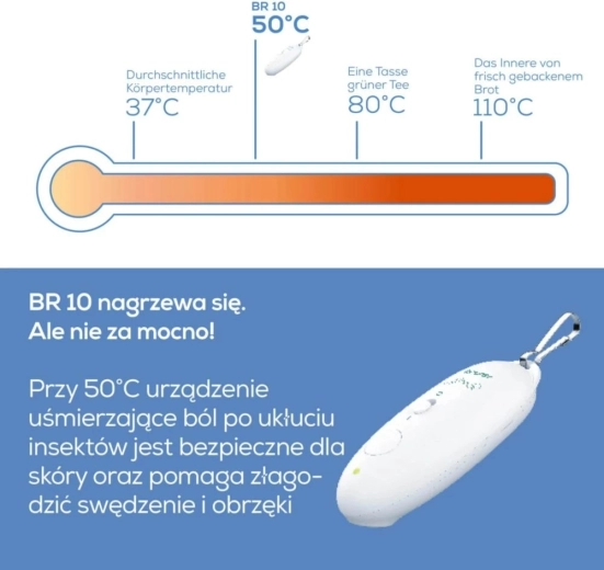 Beurer BR 10 je lékařský prostředek určený k ošetření štípanců a kousnutí hmyzem bez použití chemie – pracuje pouze s bezpečným lokálním teplem. Jednoduché a rychlé použití pomáhá snížit nepříjemné pocity a vizuální projevy podráždění pokožky.
