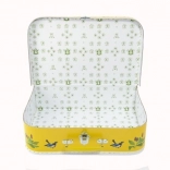 Kufřík je vybaven kovovou sponkou a pevným uchopem, což zajišťuje snadné přenášení a bezpečné zavírání.