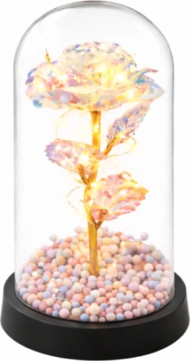 Tato designová růže v čiré skleněné kupoli kombinuje moderní styl a nadčasovou eleganci. Jemné LED osvětlení zvýrazňuje duhový efekt křišťálových okvětních lístků a společně s dekorativními kuličkami uvnitř kupole vytváří působivou hru světla. Stabilní černý podstavec a ochranný kryt zajišťují bezpečné a stylové vystavení na polici, komodě i pracovním stole.