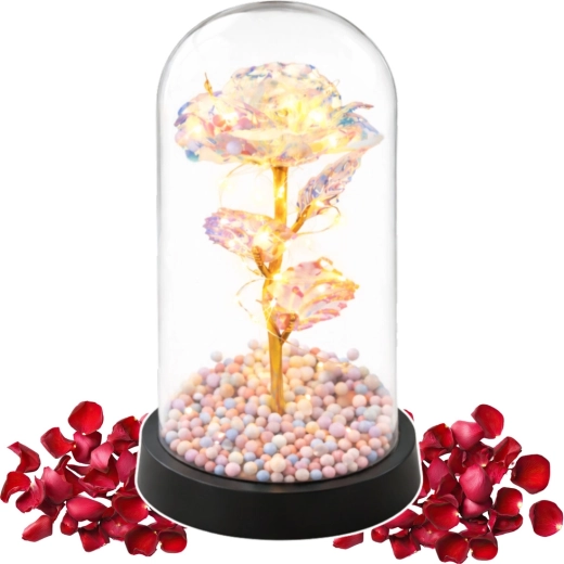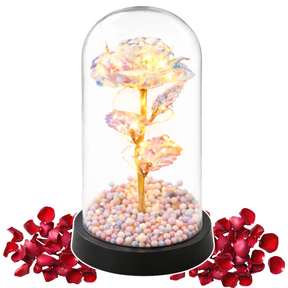 Elegantní dekorace, která rozzáří každý interiér: křišťálová věčná růže pod průhlednou kupolí se zlatým stonkem, teplými LED světýlky a barevnými korálky v podstavci. Vytváří romantickou atmosféru, nevyžaduje žádnou údržbu a je ideálním dárkem k narozeninám, výročí i na Valentýna.