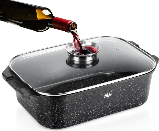 Díky dávkovači tekutin v poklici můžete během pečení doplňovat vývar, víno či marinádu bez zbytečných tepelných ztrát. Integrované rukojeti usnadňují manipulaci, zatímco odolné dno je vhodné pro trouby i všechny typy sporáků včetně indukce. Pekáč je odolný do 250 °C (se skleněnou poklicí do 220 °C).