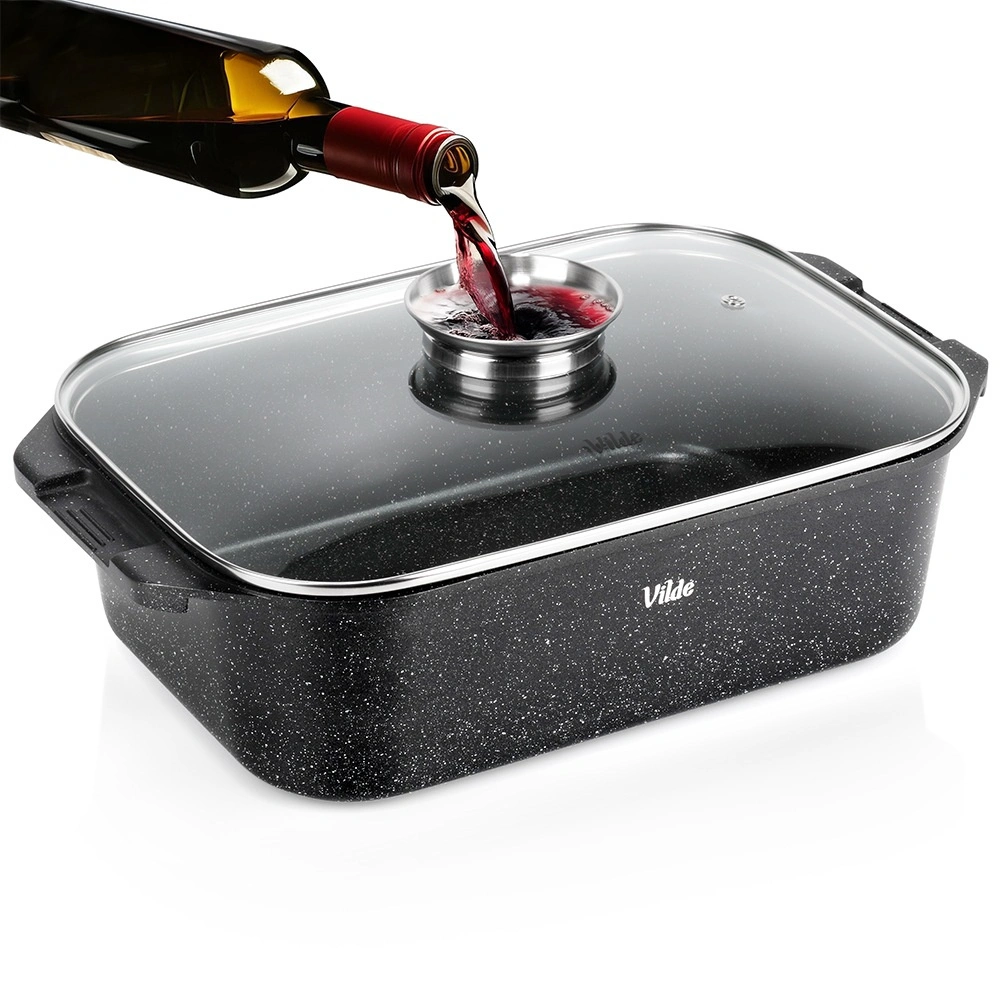Prostorný granitový pekáč o objemu 7,5 l s žáruvzdornou skleněnou poklicí je ideální pro pečení, dušení i zapékání. Odolné litinové hliníkové tělo s nepřilnavým granitovým povrchem umožňuje vařit s minimem tuku, výborně akumuluje teplo a udržuje pokrmy déle teplé. Poklice s integrovaným dávkovačem dovolí přilévat vodu, víno či tekuté koření bez nadzvedávání.
