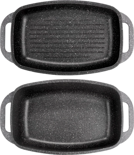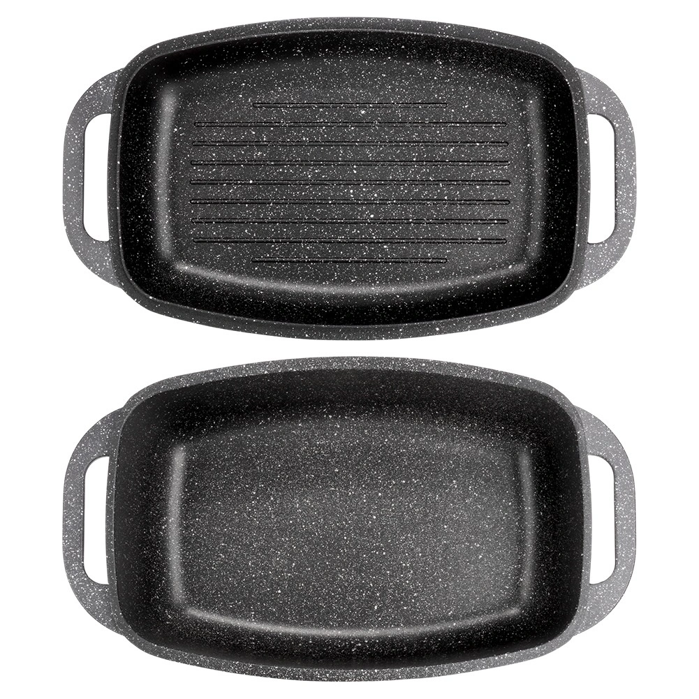Pekáč je vyroben z odolného hliníkového odlitku s nepřilnavou granitovou vrstvou, která umožní vaření s minimem oleje a snadné čištění. Materiál výborně akumuluje teplo, takže pokrmy zůstávají déle teplé a rovnoměrně propečené. Ergonomická madla na obou dílech zajišťují bezpečné přenášení.