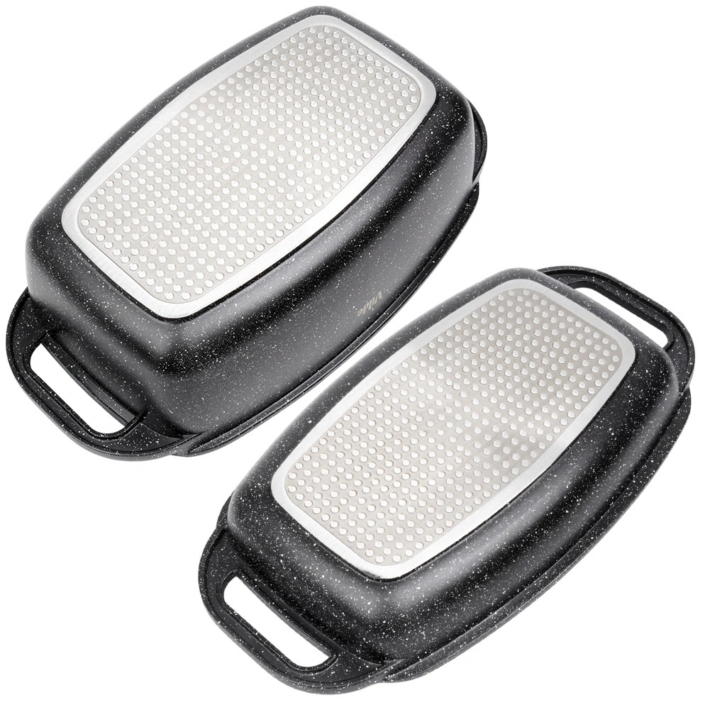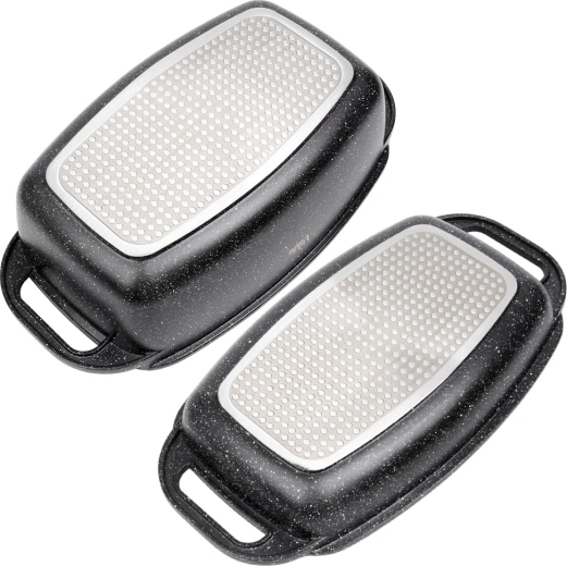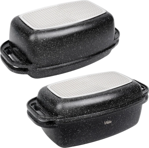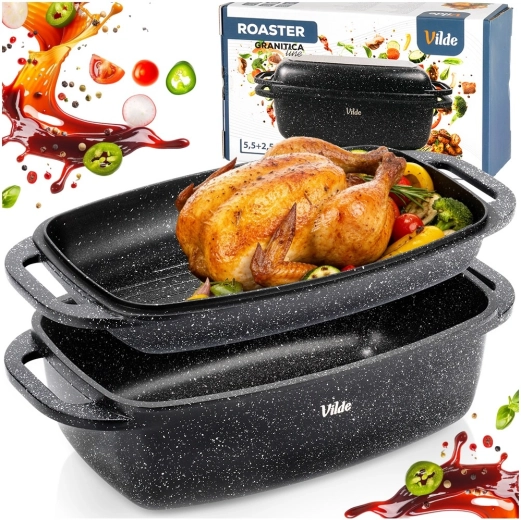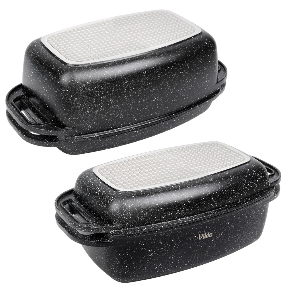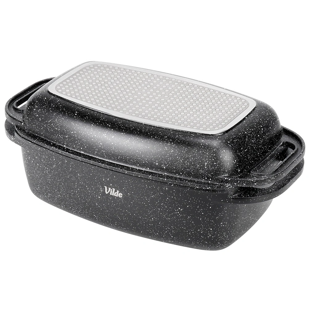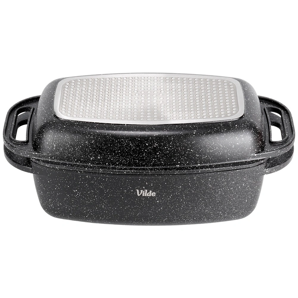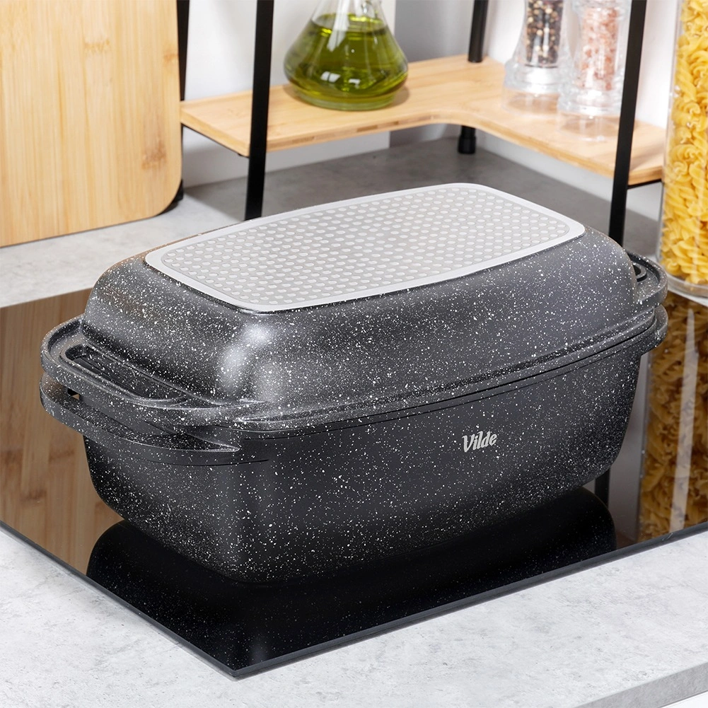 Praktický granitový pekáč s víkem 2v1 pro pečení, dušení a zapékání. Víko slouží také jako samostatná pánev/gril. Hliníkový odlitek s nepřilnavým granitovým povrchem, indukční dno a bezpečné madla pro snadnou manipulaci. Objem 5,5 l + 2,5 l, rozměry 40 × 22,5 cm, odolnost do 250 °C, vhodné do trouby i na všechny typy sporáků a do myčky. VILDE Granitica.
