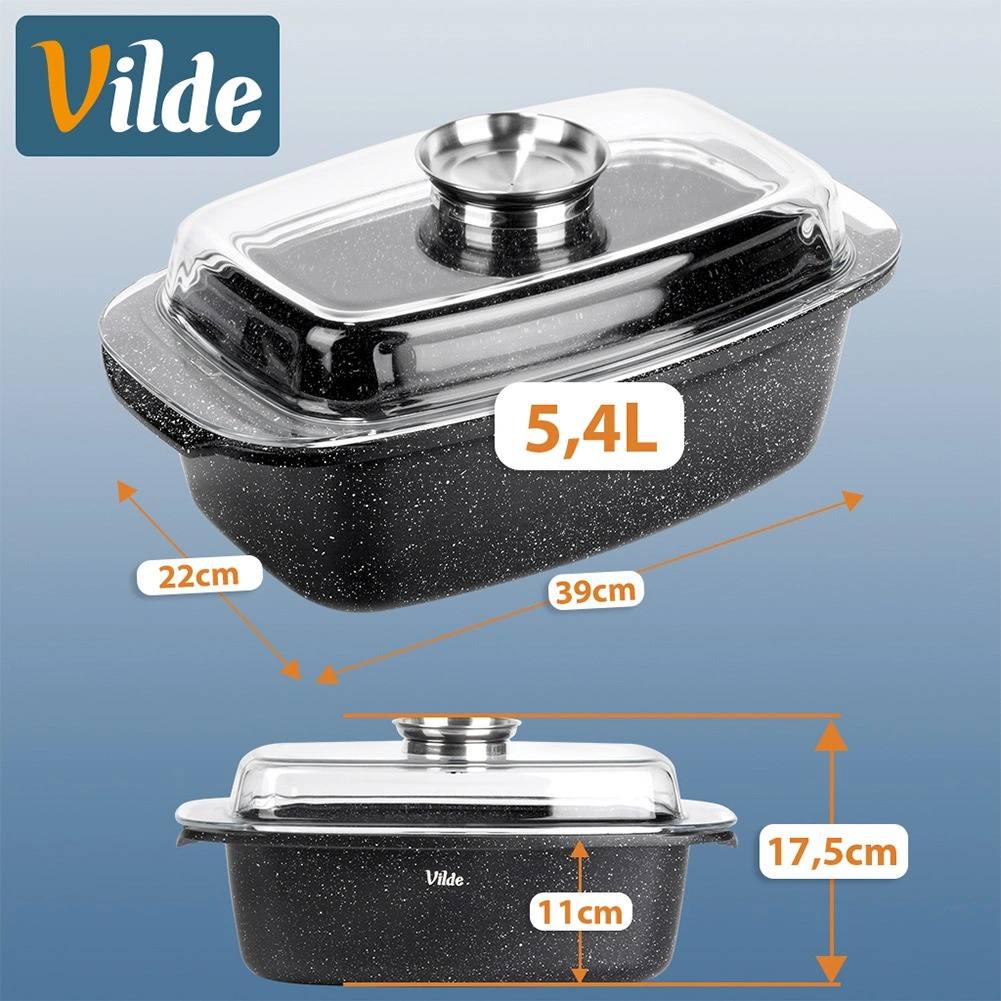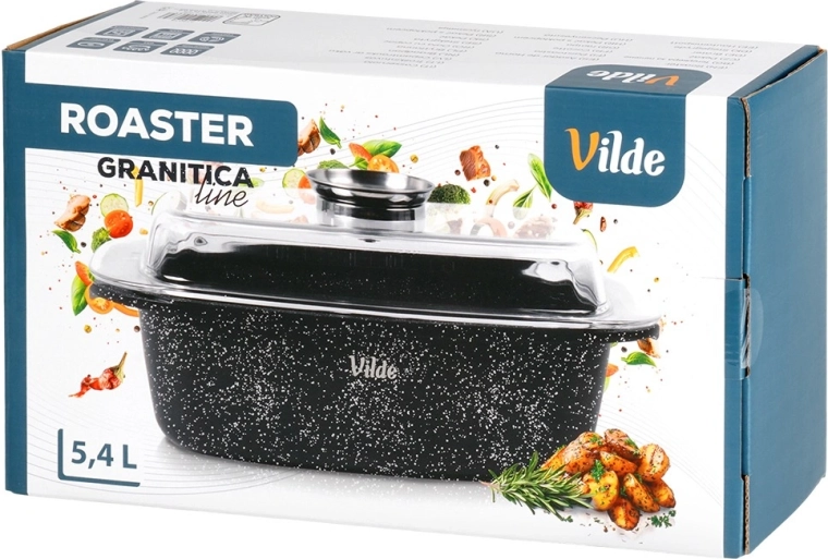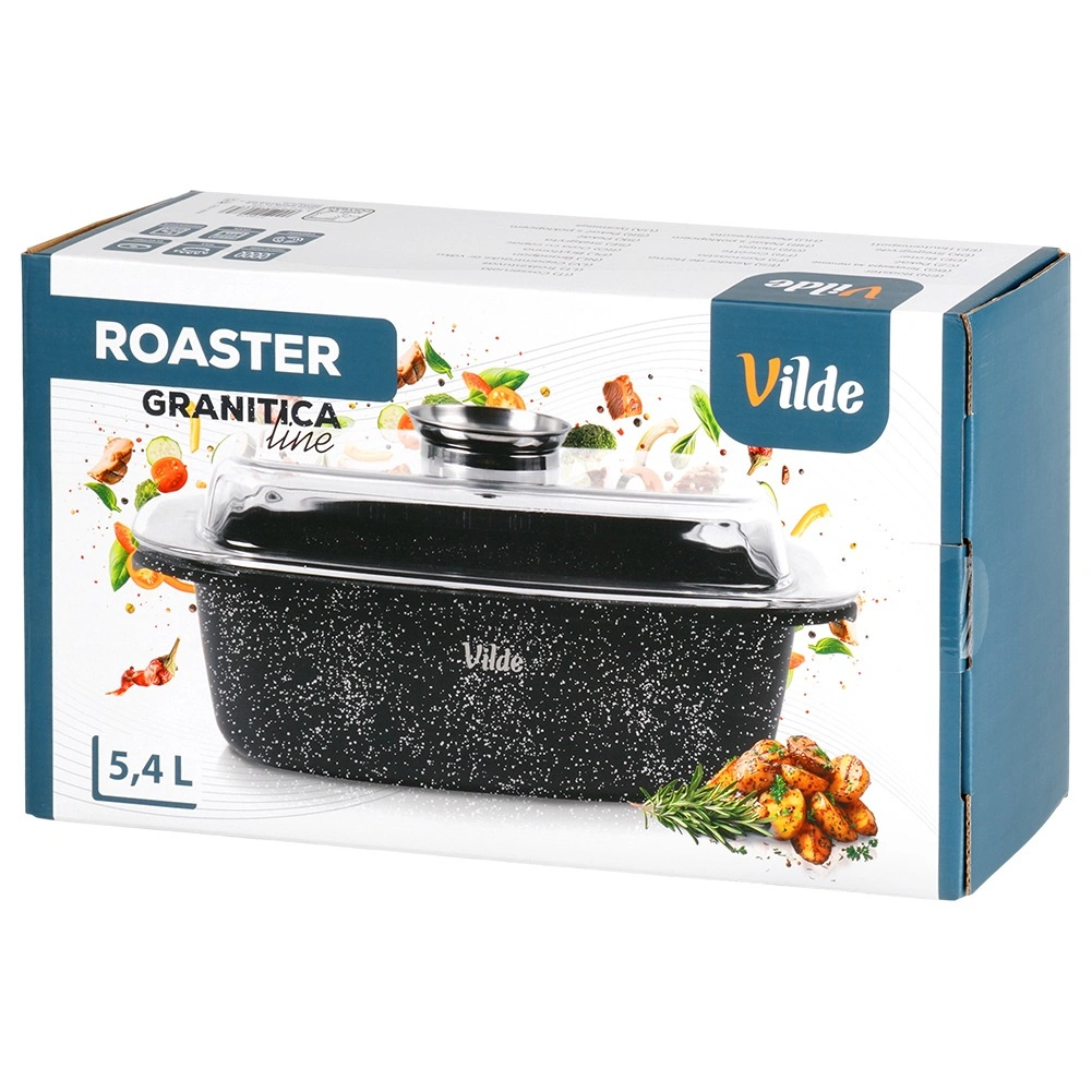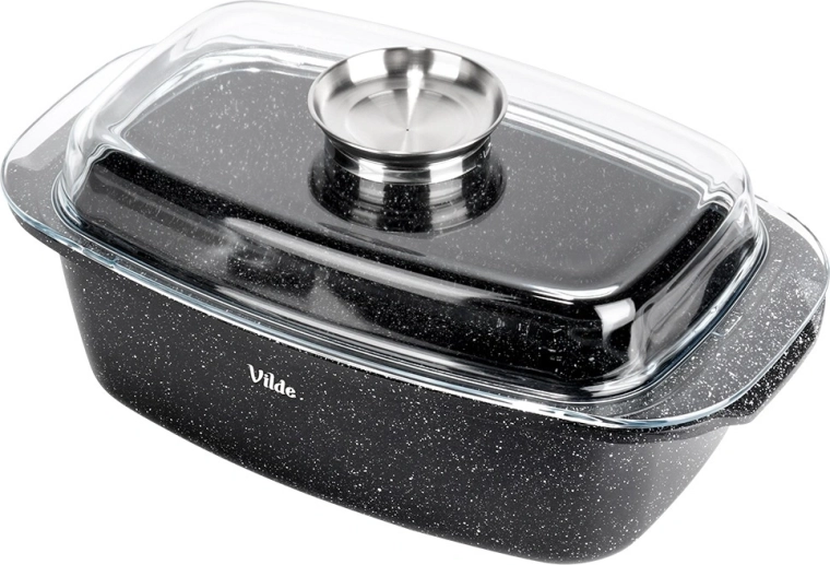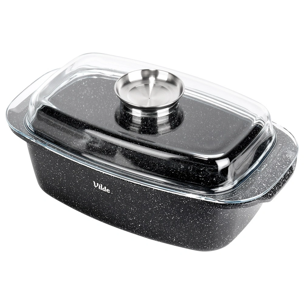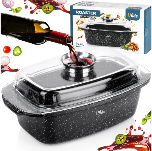 Obdélníkový pekáč z odlitku hliníku s odolnou granitovou nepřilnavou vrstvou je všestranným pomocníkem pro každodenní vaření. Skleněné víko s centrálním dávkovačem tekutých přísad umožní doplňovat vodu, víno či marinádu bez zvedání víka – pro šťavnaté a aromatické výsledky.