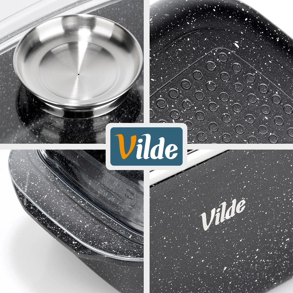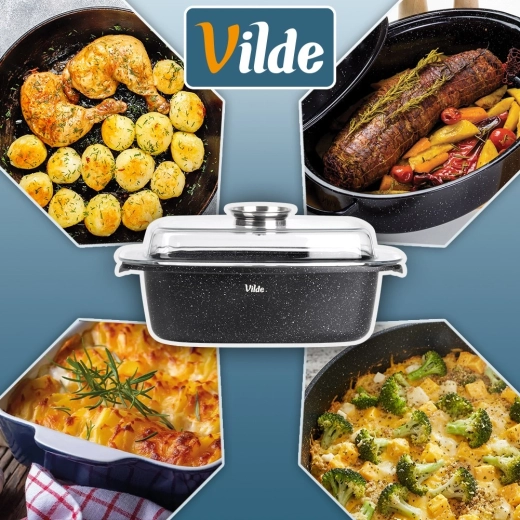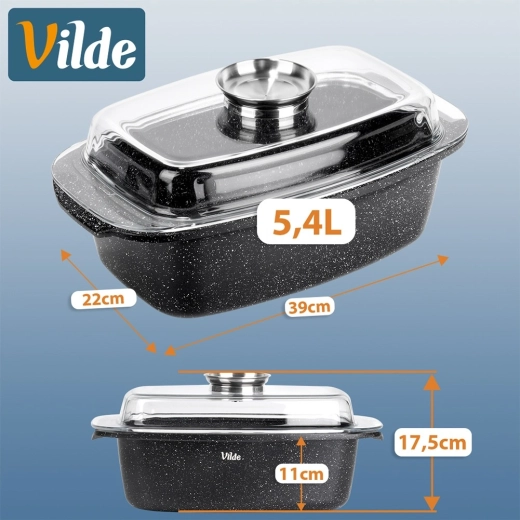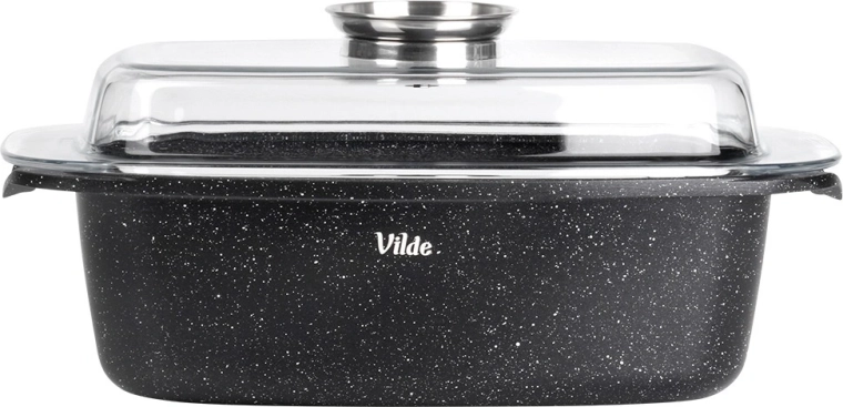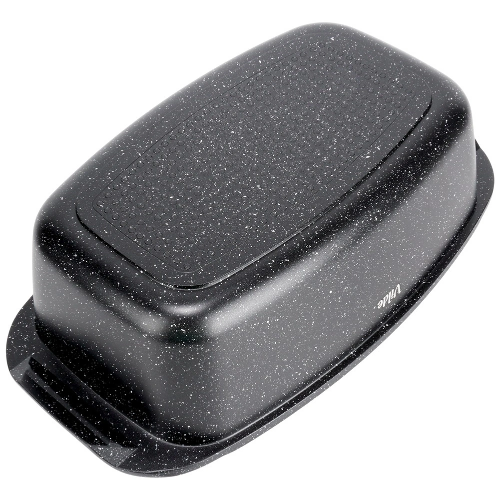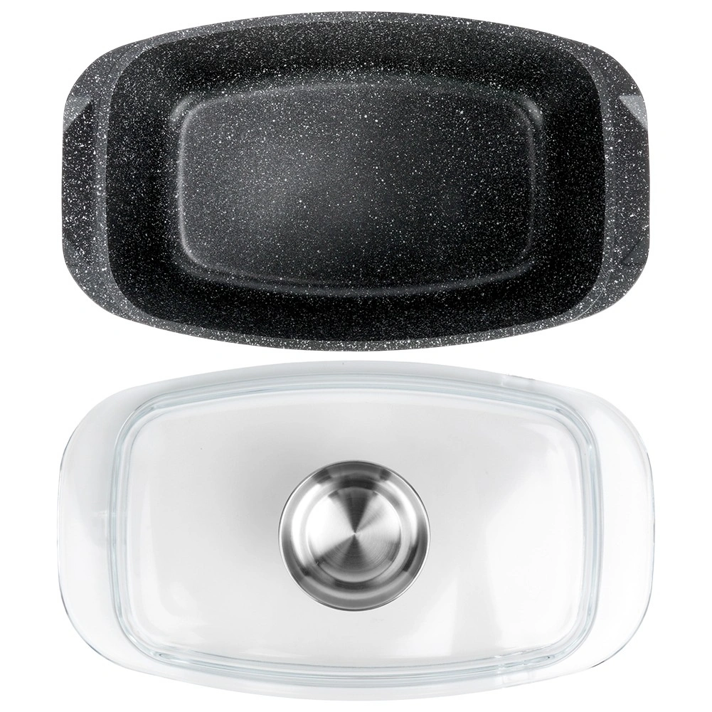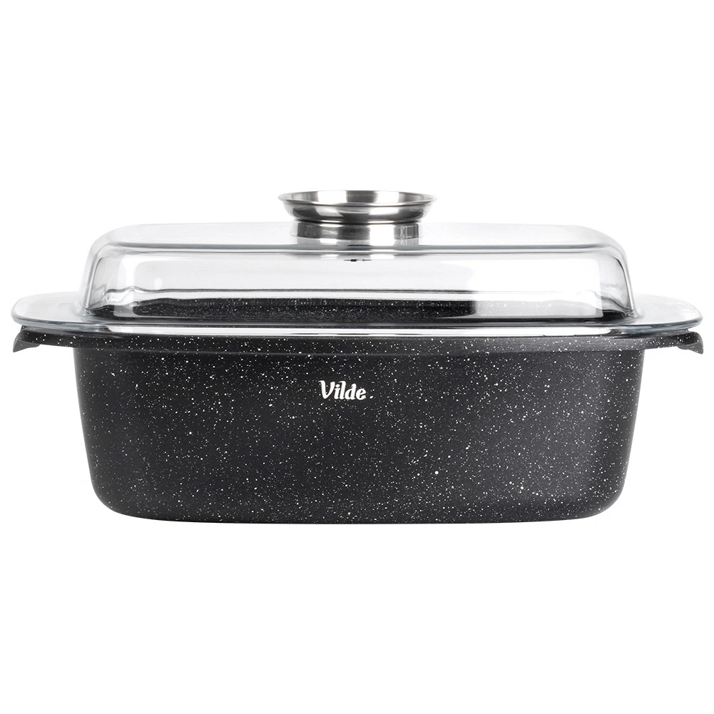 Obdélníkový pekáč z odlitku hliníku s odolnou granitovou nepřilnavou vrstvou je všestranným pomocníkem pro každodenní vaření. Skleněné víko s centrálním dávkovačem tekutých přísad umožní doplňovat vodu, víno či marinádu bez zvedání víka – pro šťavnaté a aromatické výsledky.