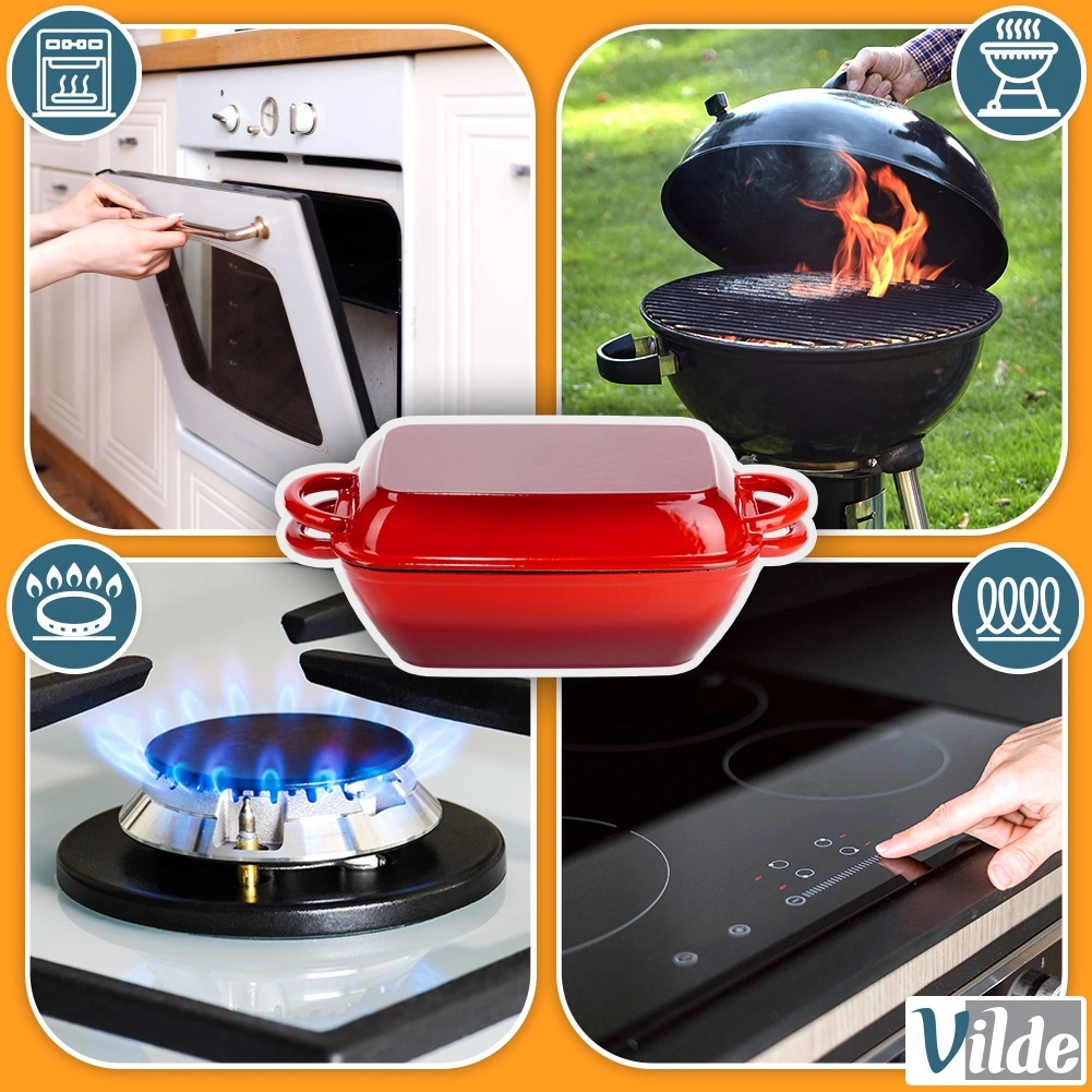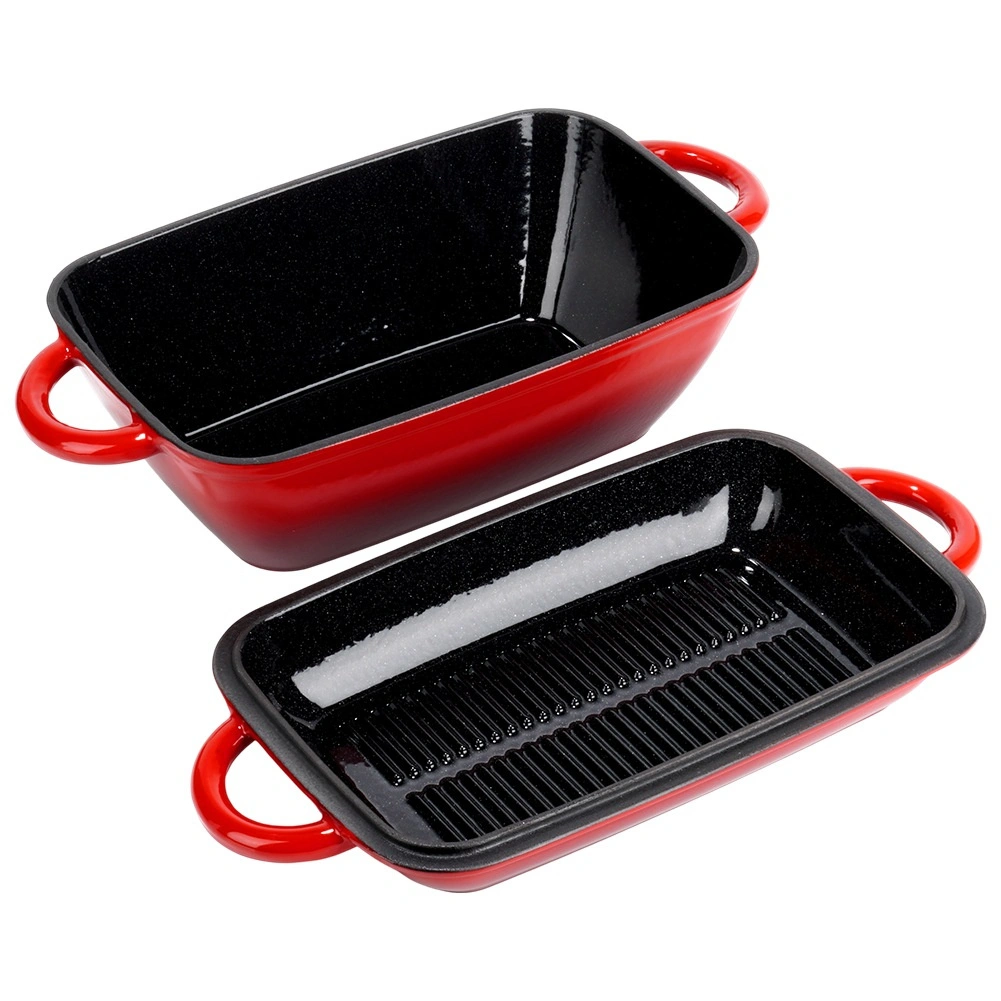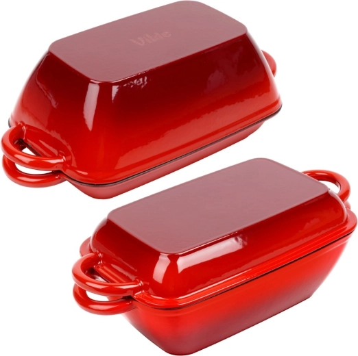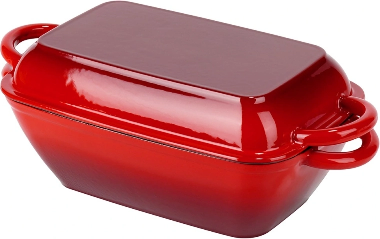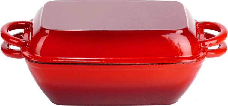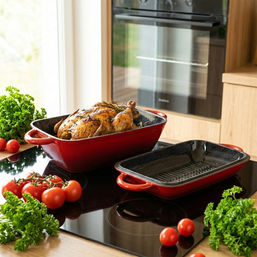 Univerzální litinová pekáčová sada 2v1 pro pečení, dušení i zapékání. Víko slouží jako samostatná grilovací pánev s rýhovaným dnem, samotný pekáč nabízí rovnoměrné vedení tepla a dlouhé udržení teploty. Odolné smaltované provedení, pohodlné boční úchyty a použití na všech typech sporáků včetně indukce i v troubě.