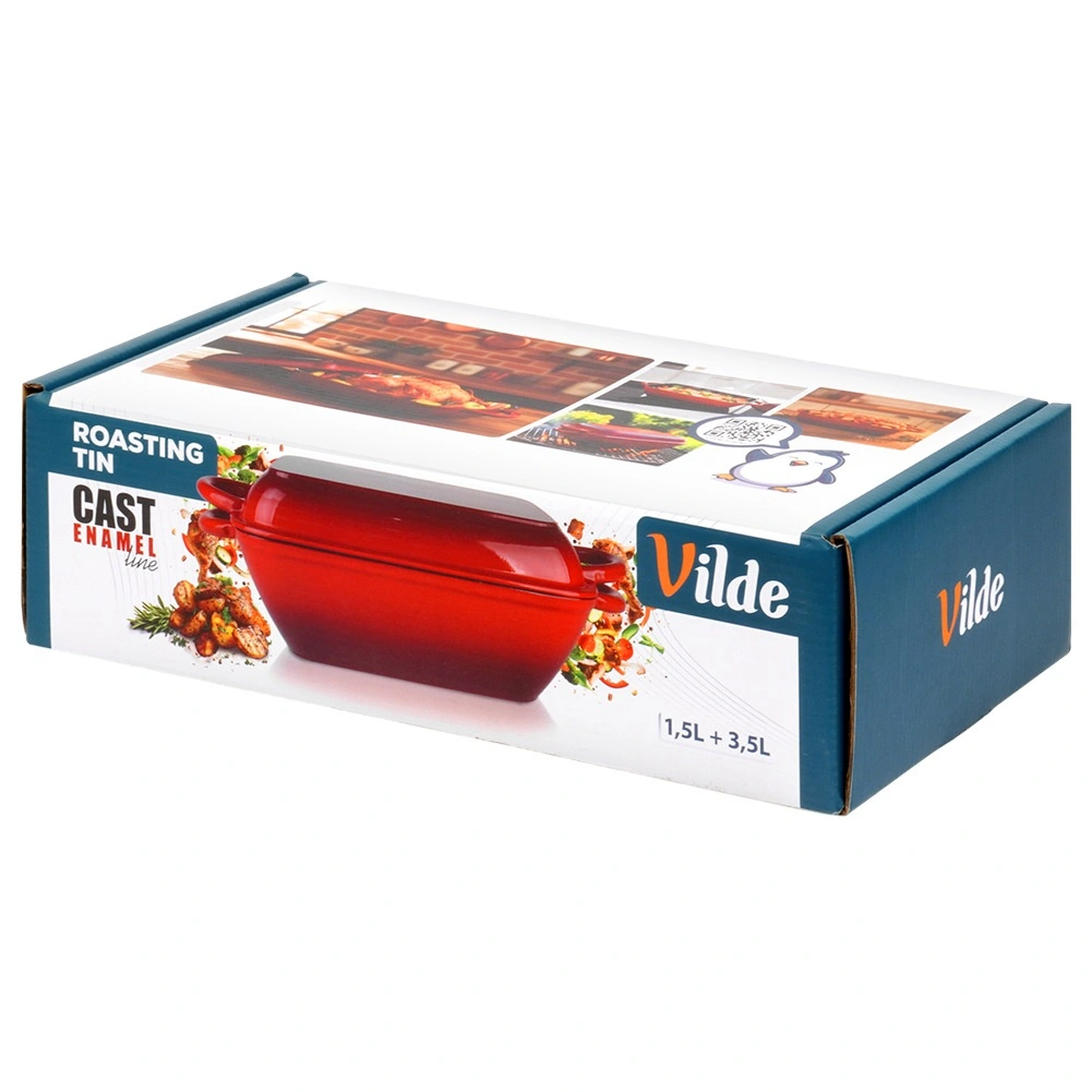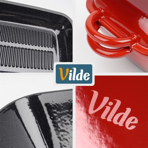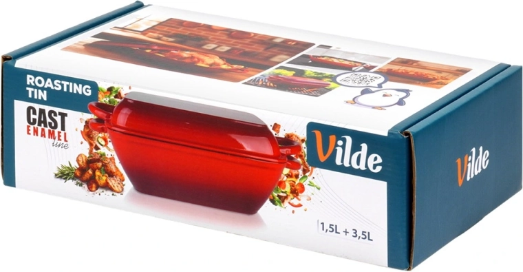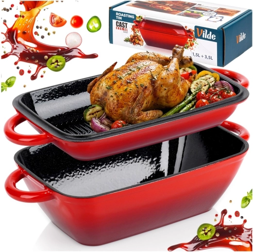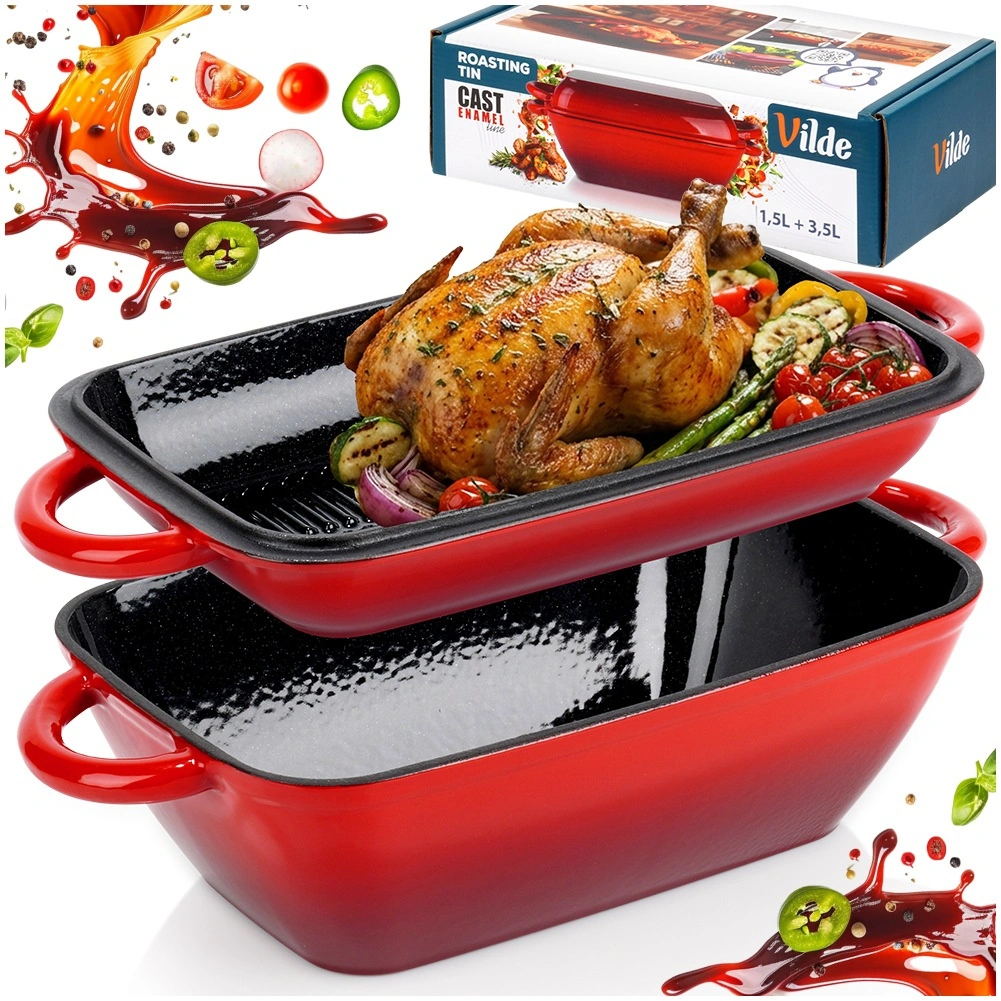 S touto litinovou sadou 2v1 připravíte šťavnaté pečeně, vydatné jednohrnce i křupavou zeleninu. Spodní pekáč (3,5 l) je ideální pro pečení a dušení, horní víko (1,5 l) lze používat samostatně jako pekáček nebo grilovací pánev s rýhovaným povrchem. Smaltovaný povrch je odolný, snadno se čistí a pomáhá bránit připalování.