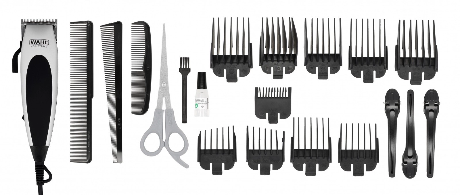 Nástavce různých délek, hřeben, nůžky, olej a kartáček – vše, co potřebujete pro úpravu účesu doma.