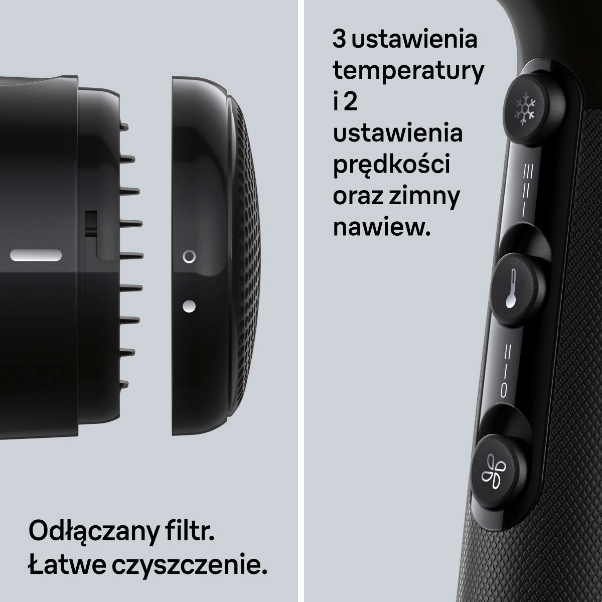 Intuitivní ovládání umožňuje přepínat mezi několika stupni teploty a rychlosti, takže se přizpůsobí různým typům vlasů. Funkce studeného vzduchu účes zafixuje a dodá mu lesk. Přesná tryska zajistí koncentrovaný proud vzduchu pro rychlejší výsledky bez krepacení.