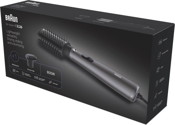 Lehká a všestranná horkovzdušná kulma s výkonem 800 W pro stylizaci a zvětšení objemu. Technologie ionizace uhlazuje vlasy a redukuje krepatění. Nabízí jednoduché ovládání posuvným přepínačem, 2 výměnné nástavce s bezpečnostním zámkem, koncentrátor pro sušení a oválný termální kartáč pro objem. Snadnou údržbu zajišťuje vyjímatelný zadní filtr a přiložený čisticí kartáček.