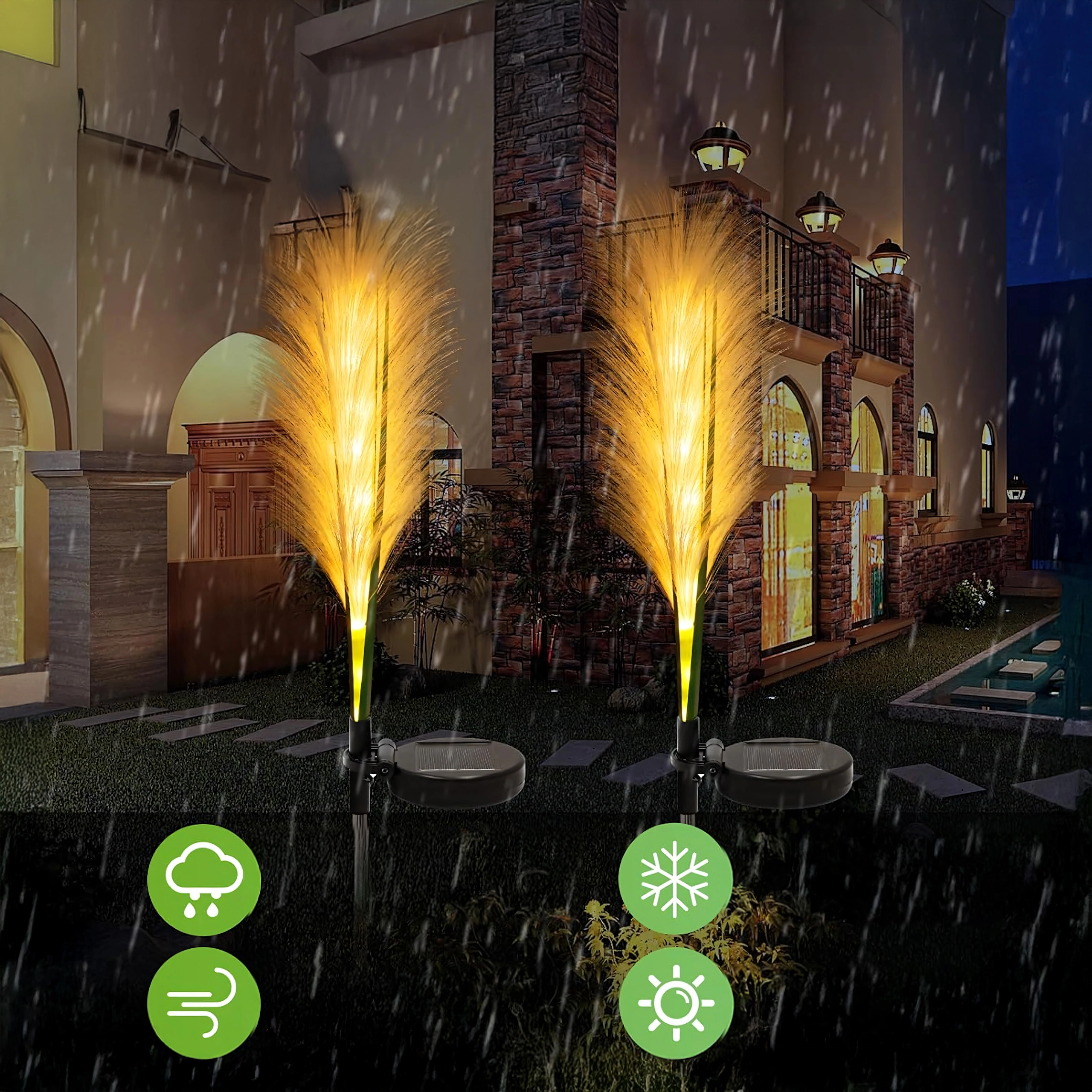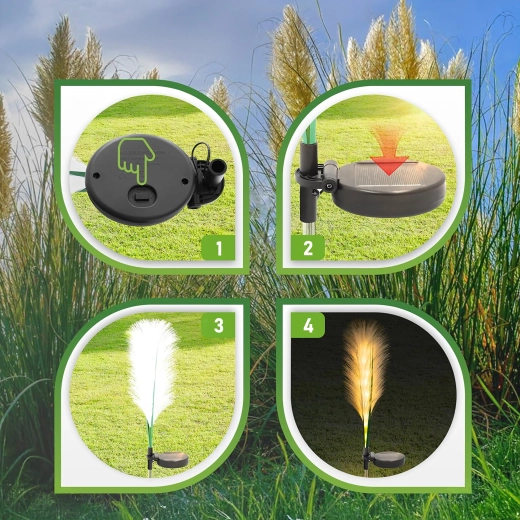 Set dvou solárních zahradních svítidel napodobujících pampovou trávu rozzáří venkovní prostor jemným, teplým světlem. Integrovaný solární panel přes den nabíjí baterii a světla se automaticky rozsvěcují v noci. Díky odolnému provedení a flexibilním vláknům vytvářejí třpytivý efekt a působí přirozeně mezi rostlinami.