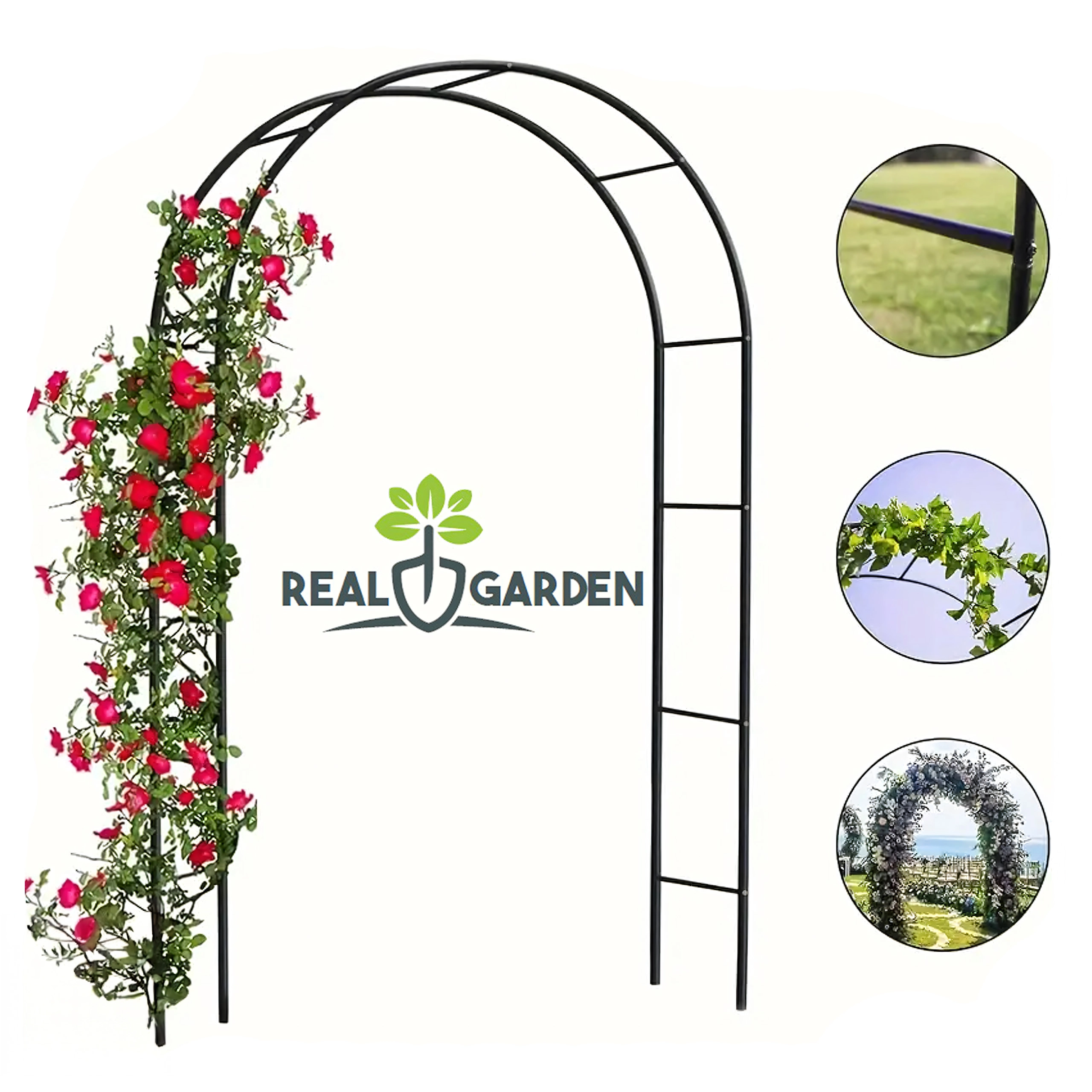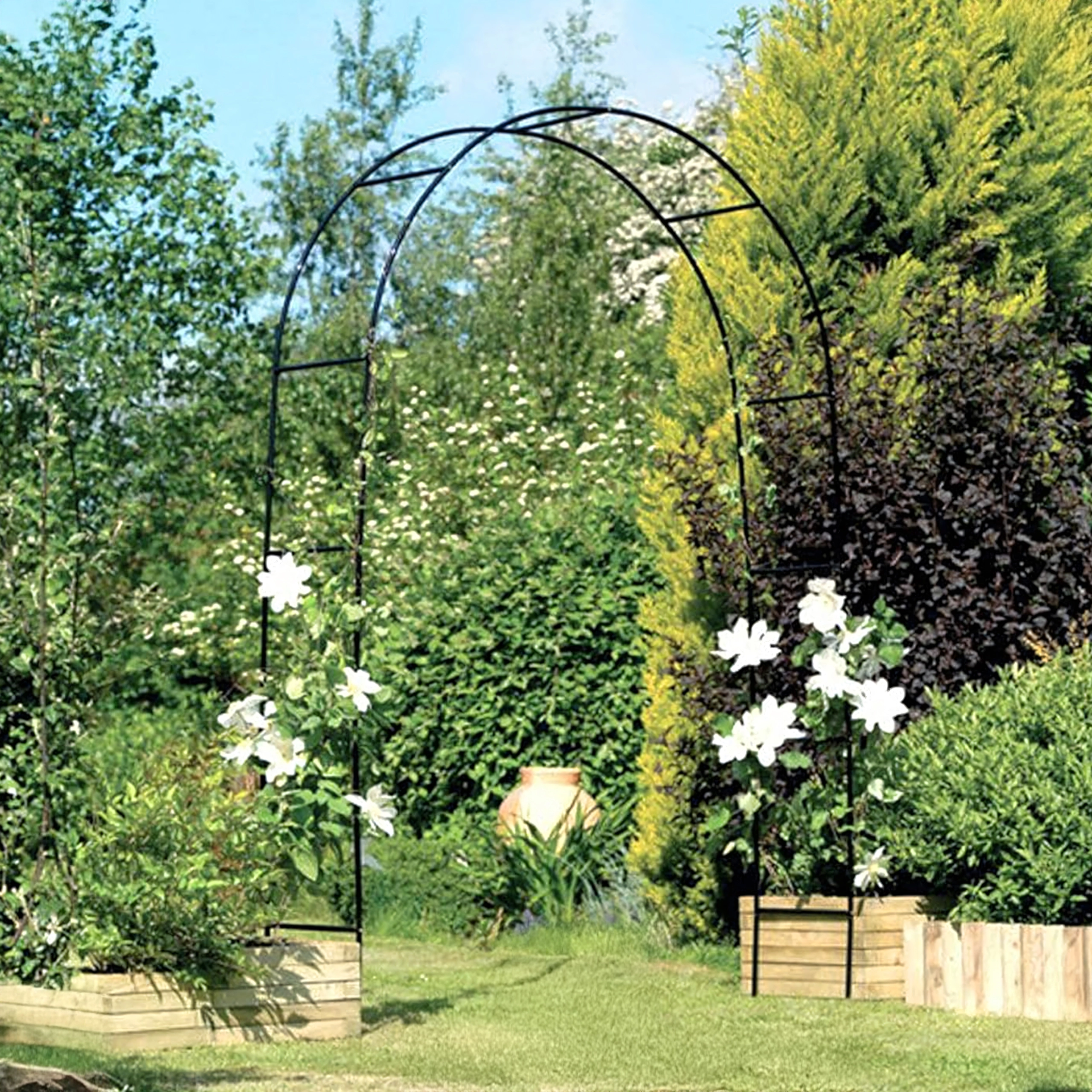 Díky modulárnímu systému trubek je sestavení rychlé a intuitivní. Minimalistický černý vzhled se hodí do moderních i klasických zahrad, na svatby i zahradní oslavy. Stačí zapustit nohy do země nebo květináčů a nechat rostliny růst do výšky.