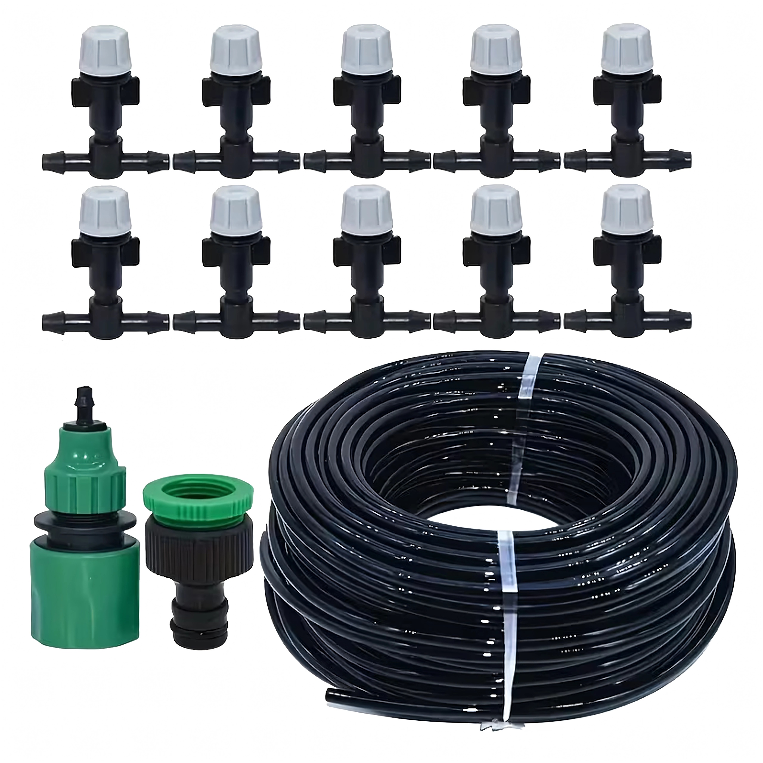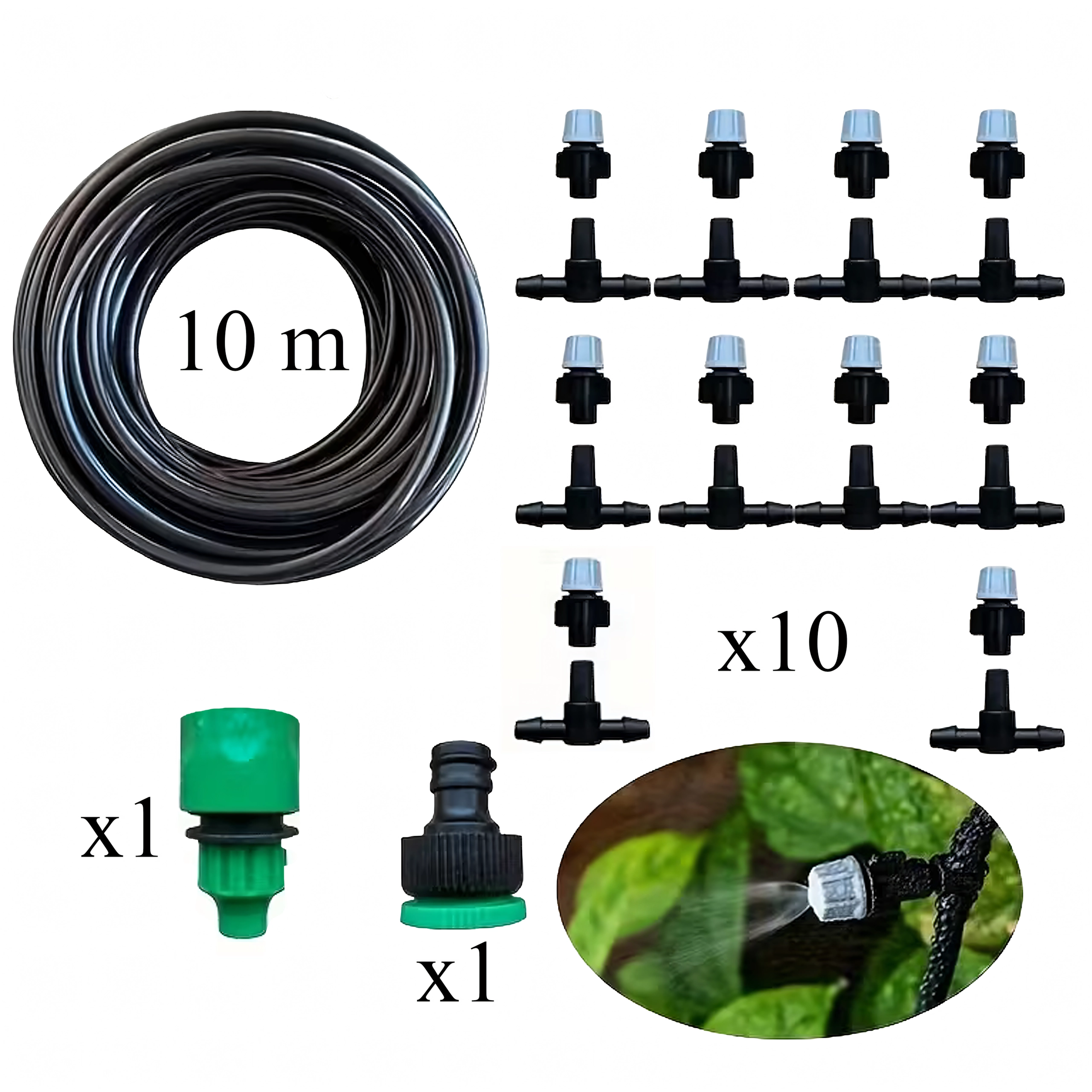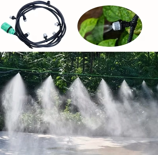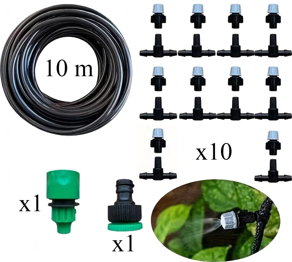 Kompletní sada pro mlžení a kapkovou závlahu o délce 10 m s 10 nastavitelnými zrašovači pro efektivní zavlažování záhonů, skleníků i květináčů. Umožňuje jemnou mlhu pro ochlazování a rovnoměrné zavlažení bez plýtvání vodou. Jednoduchá instalace, úspora vody a možnost přizpůsobení směru a intenzity postřiku.