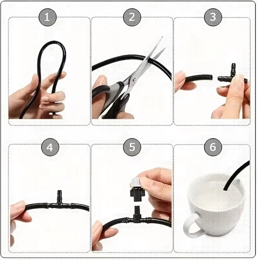 Instalace je rychlá: připojte hadici přes přiložený adaptér k vodovodnímu kohoutu, rozveďte 10m potrubí, umístěte trysky a dolaďte směr a intenzitu. Odolné materiály jsou vhodné pro venkovní použití, zatímco nastavitelné emitéry minimalizují spotřebu vody a zamezují přemokření.