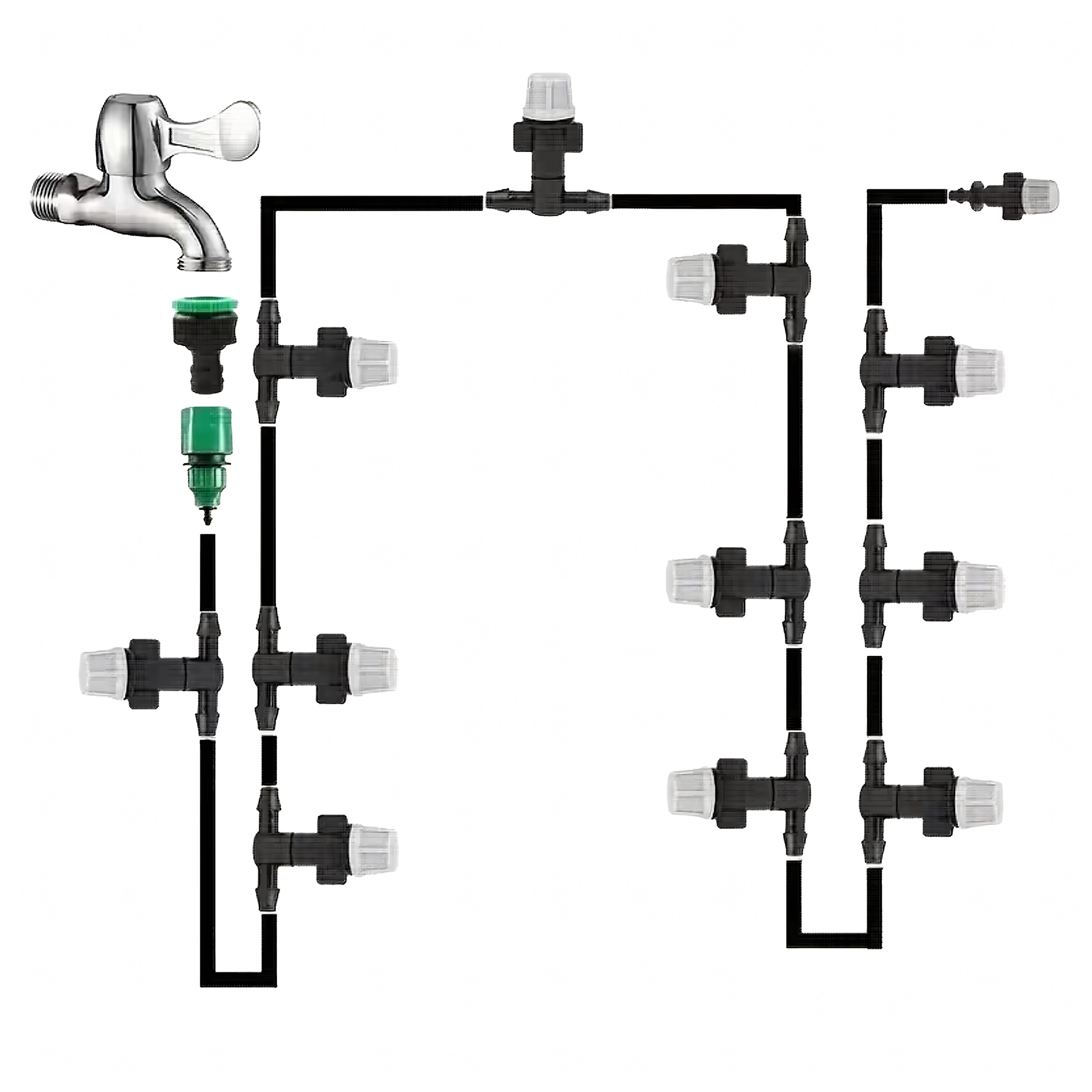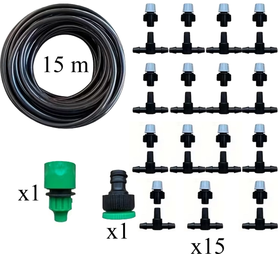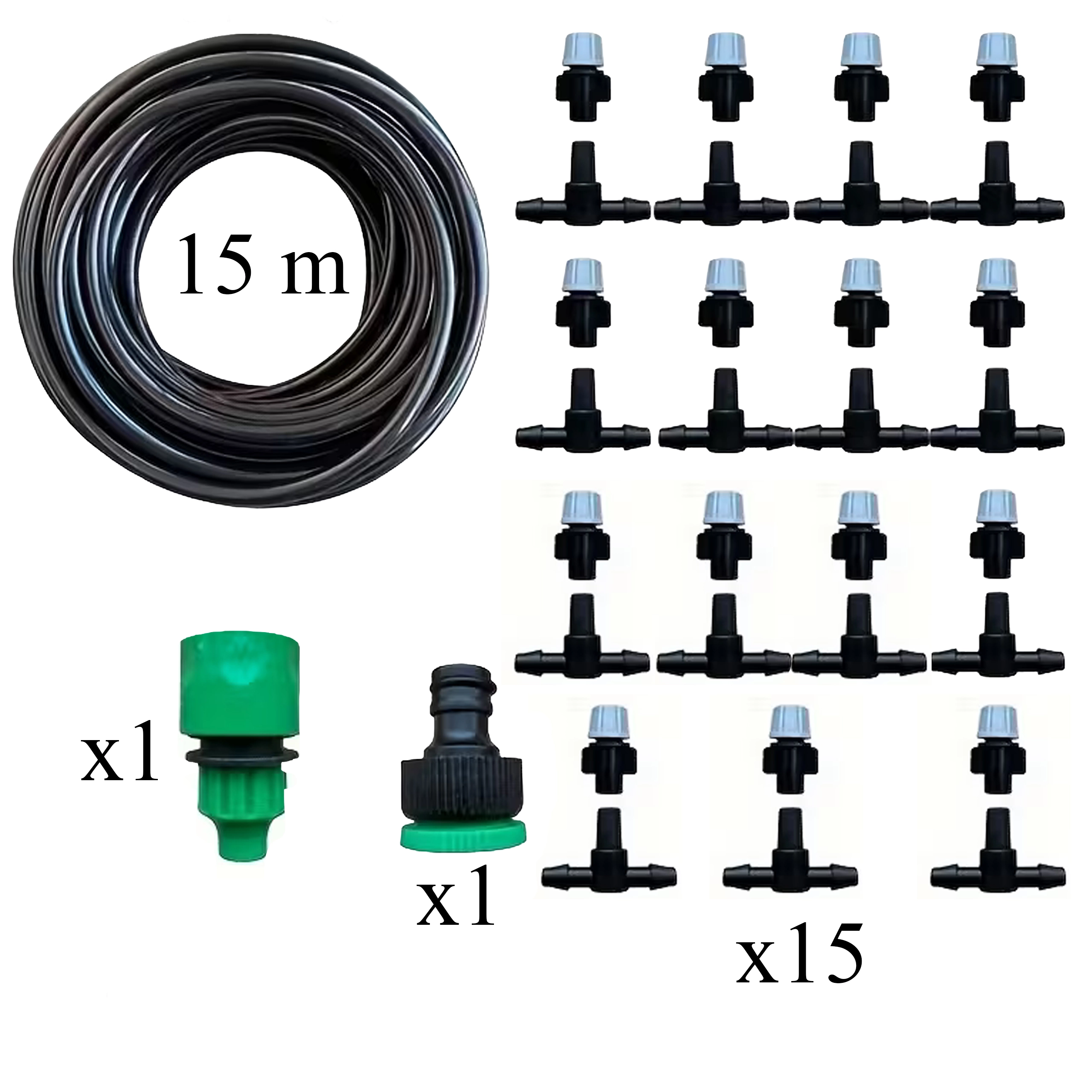Instalace je rychlá a intuitivní: připojíte přes dodaný konektor, rozvedete hadici a umístíte trysky podle potřeby. Nastavitelná mlžicí/kapková hlavice umožní přizpůsobit průtok a úhel rozprašování pro různé typy rostlin. Systém poskytuje úsporu vody, rovnoměrnou distribuci vláhy a stabilní mikroklima pro zdravý růst.