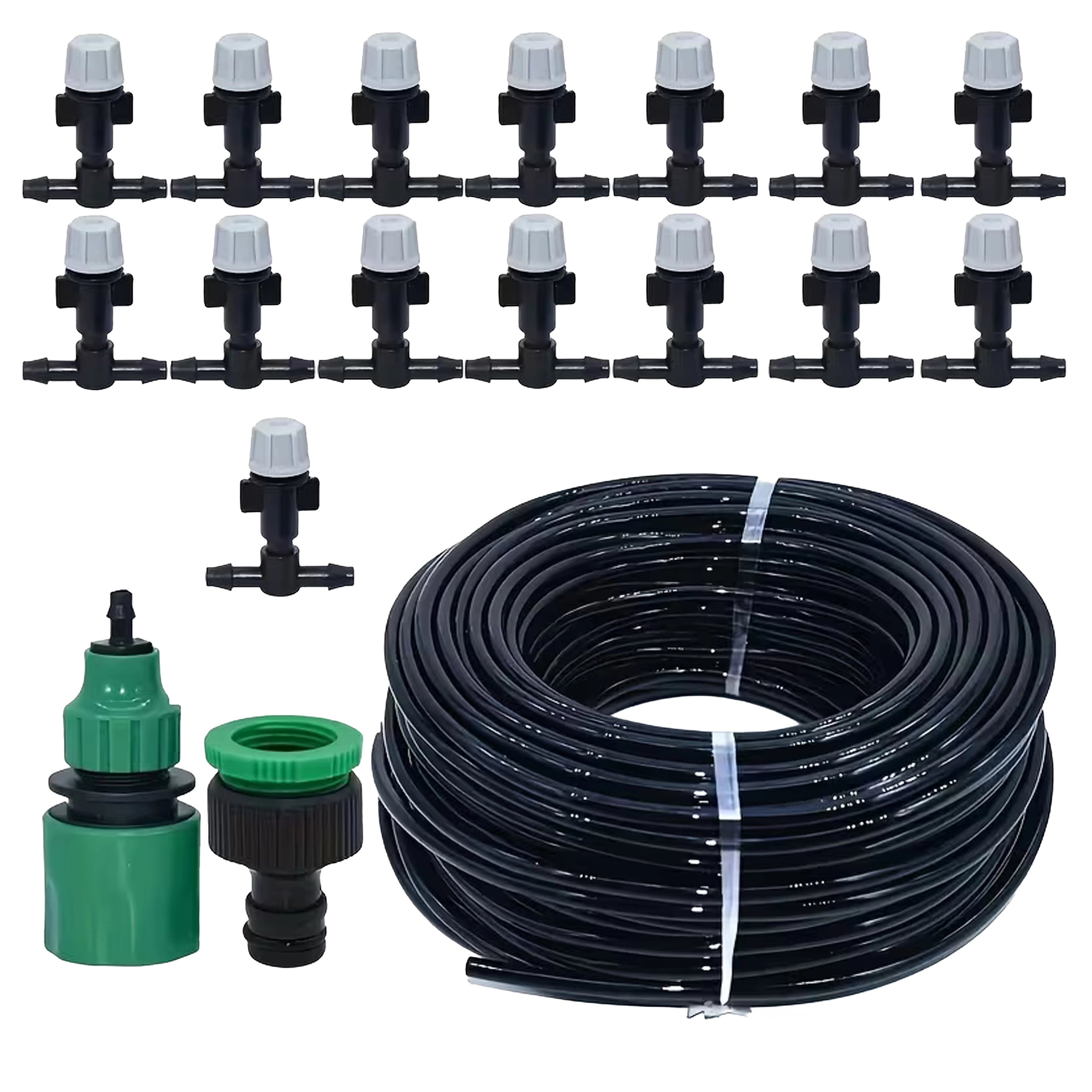 Lehká hadice s praktickými T‑spojkami umožňuje rychlé vedení podél záhonů či konstrukcí. Trysky rozmístíte přesně tam, kde je vlhkost nejvíce potřeba.