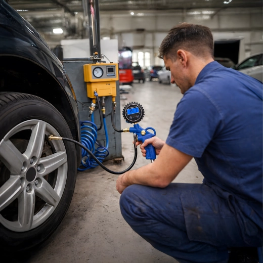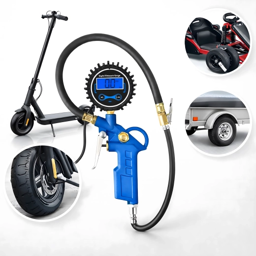 Integrovaný elektronický manometr umožňuje rychlou kontrolu tlaku a přesné dofukování bez nutnosti dalšího nářadí. Vhodné pro pneumatiky osobních aut, motocyklů i jízdních kol a pro práci s dílenským kompresorem.