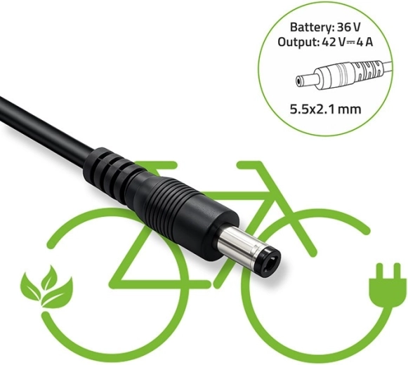 Praktická a výkonná nabíječka pro elektrokola a elektroskútry s napětím baterie 36 V (nabíjecí napětí 42 V) a proudem 4 A zajišťuje efektivní nabíjení z běžné zásuvky 230 V. Díky kapacitě 168 W a konektoru 5.5×2.1 mm je ideální pro většinu Li-ion akumulátorů 36 V. LED kontrolka přehledně ukazuje průběh: červená = nabíjení, zelená = plně nabito.