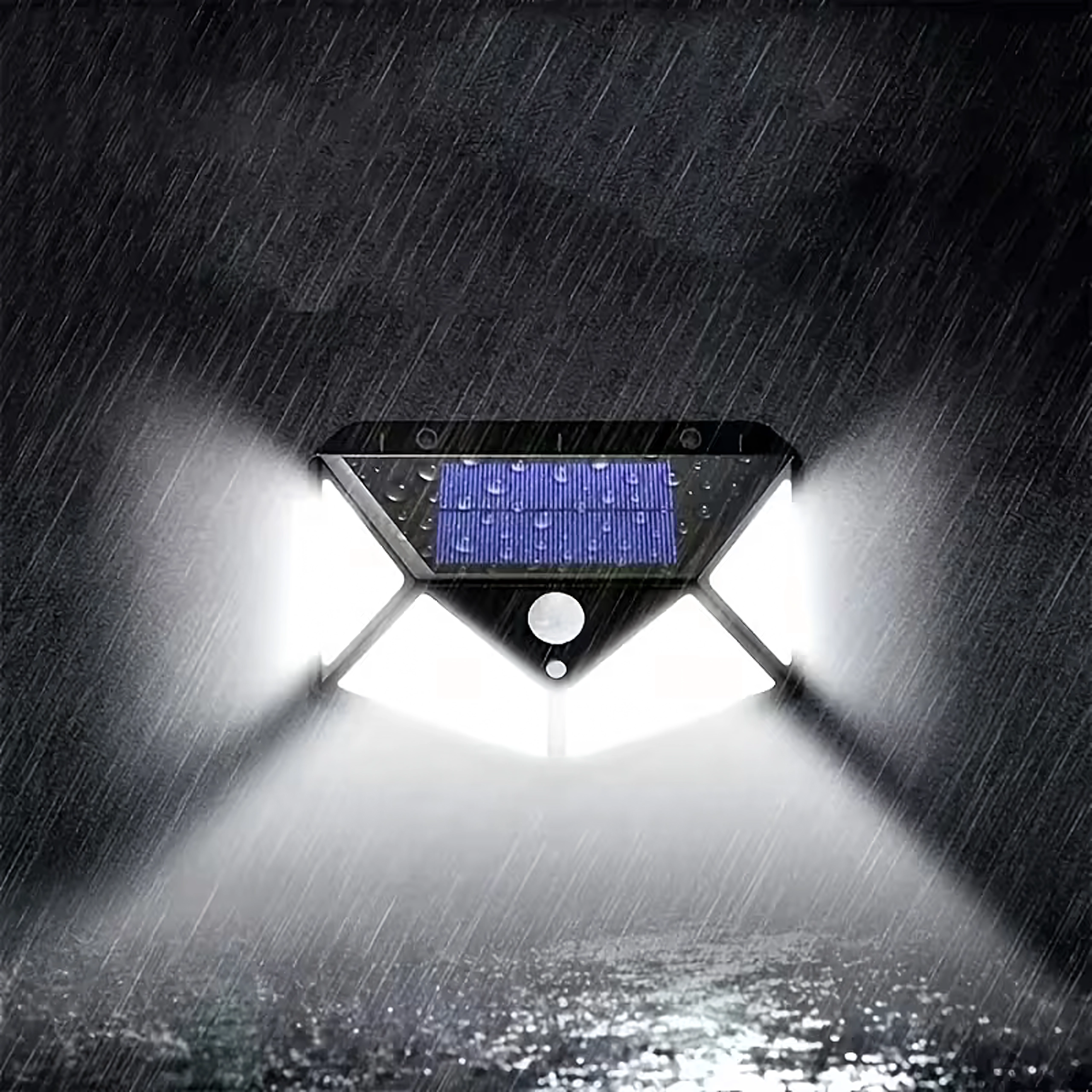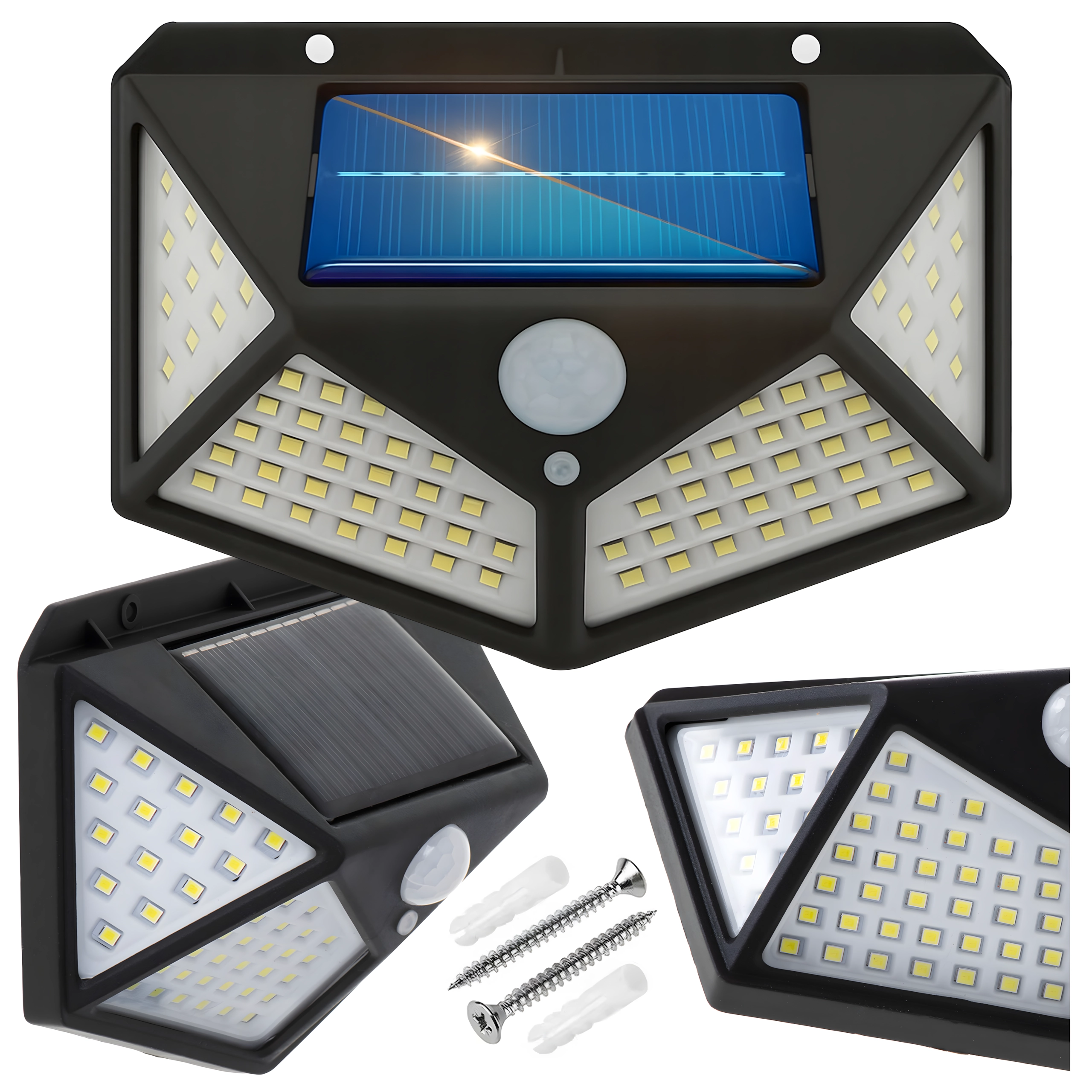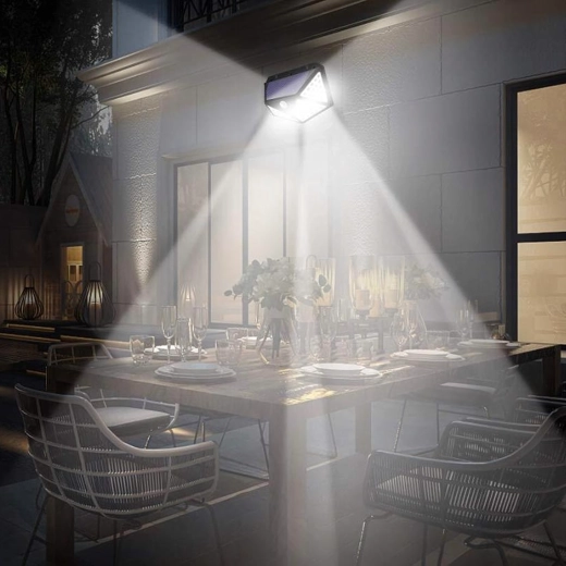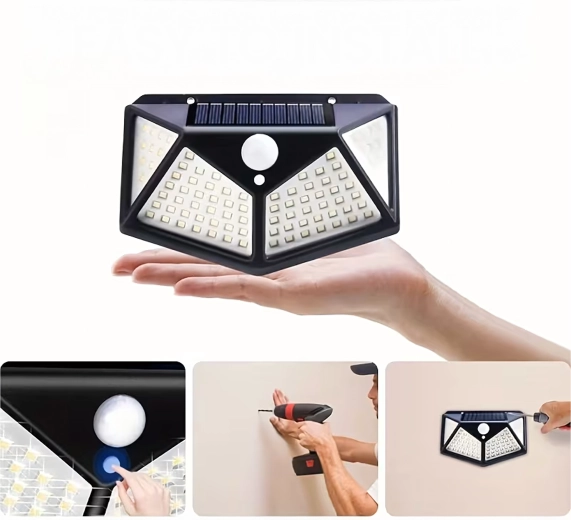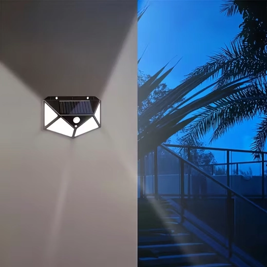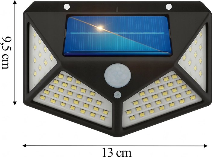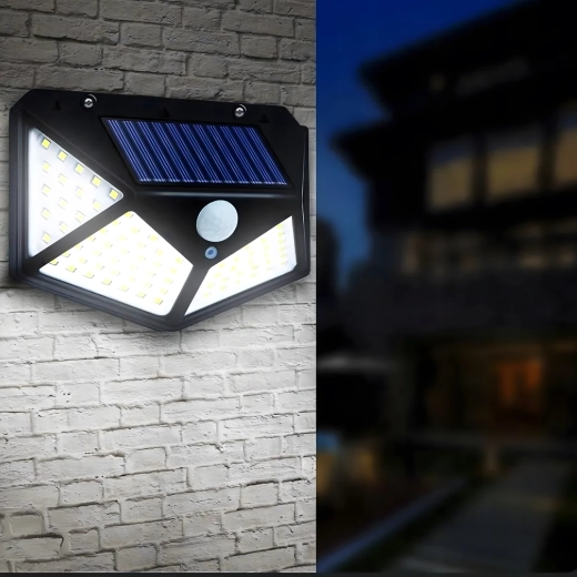 Praktické venkovní solární světlo s 100 LED pro širokoúhlé osvětlení chodníků, vchodů a zahrad. Díky soumrakovému a PIR čidlu se automaticky rozsvítí při setmění a pohybu, je bez kabelů, odolné vůči počasí a snadno se montuje na stěnu.