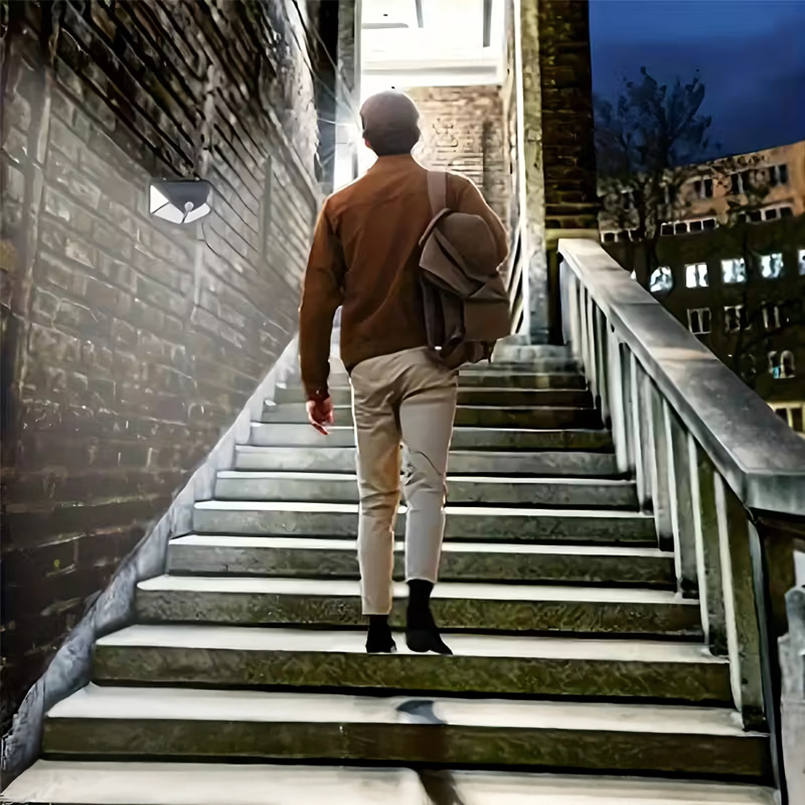 Světlo se samo zapne při setmění a zesílí při detekci pohybu pro bezpečí a úsporu energie.