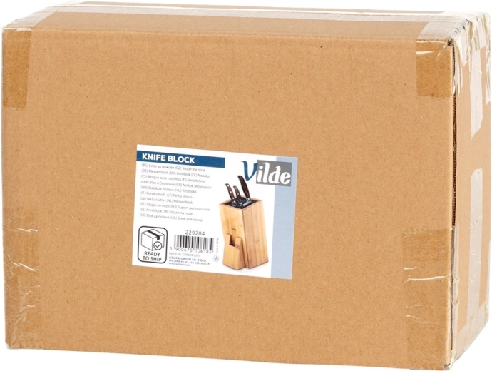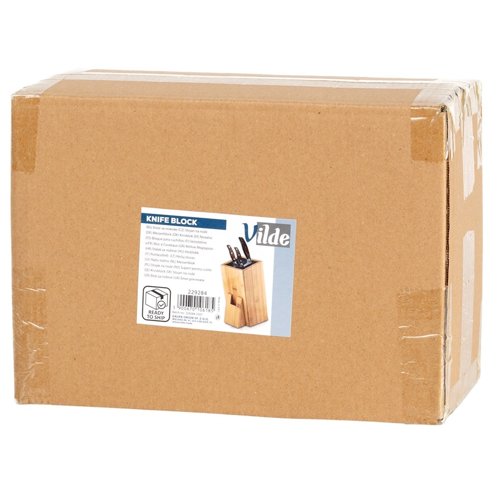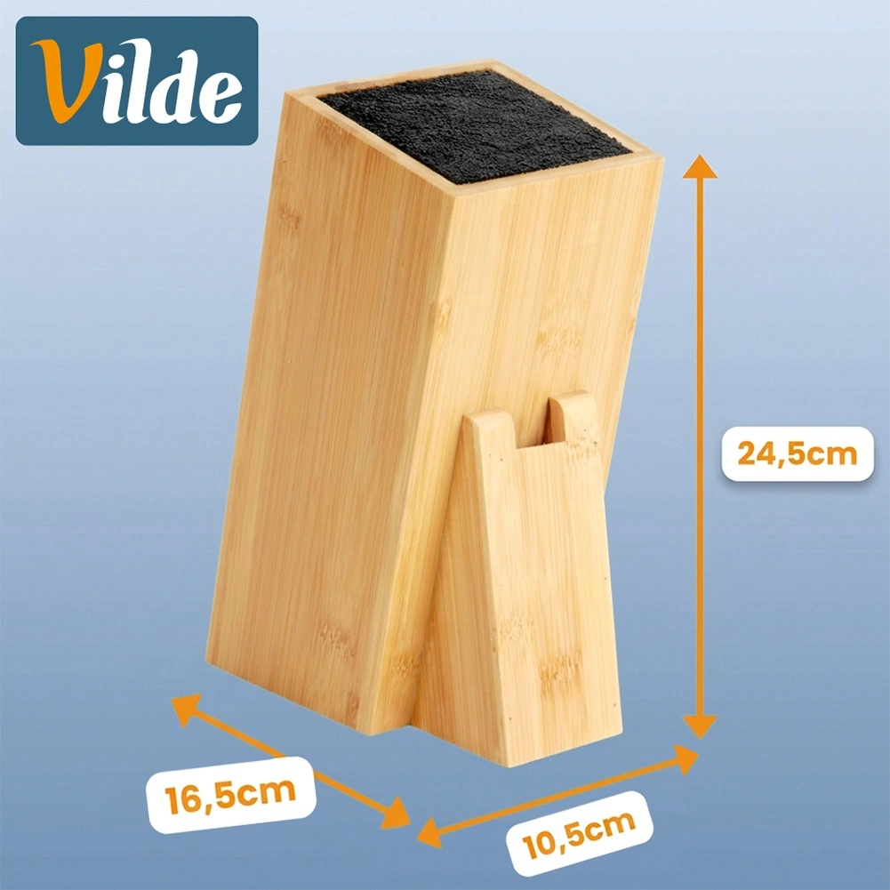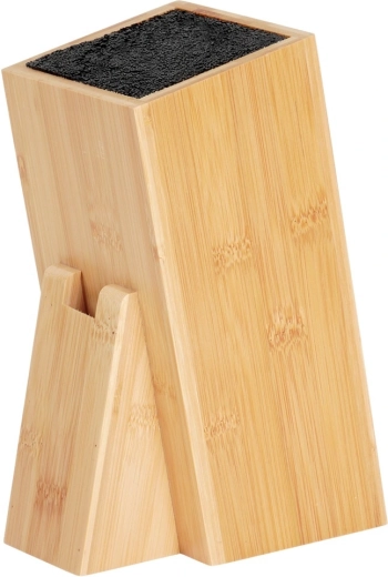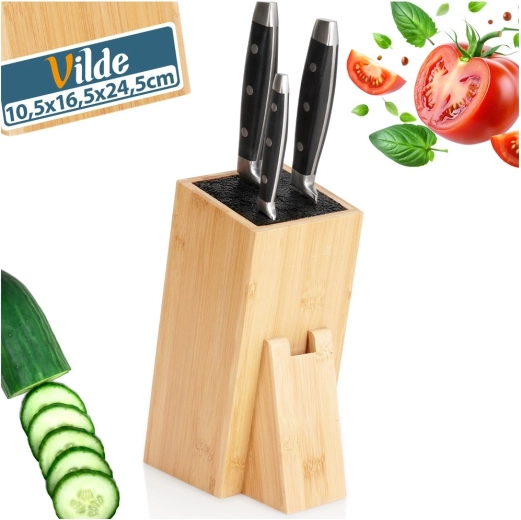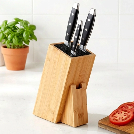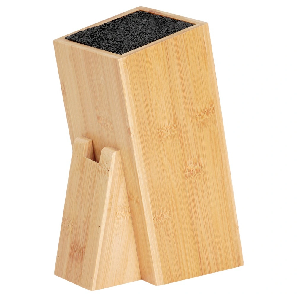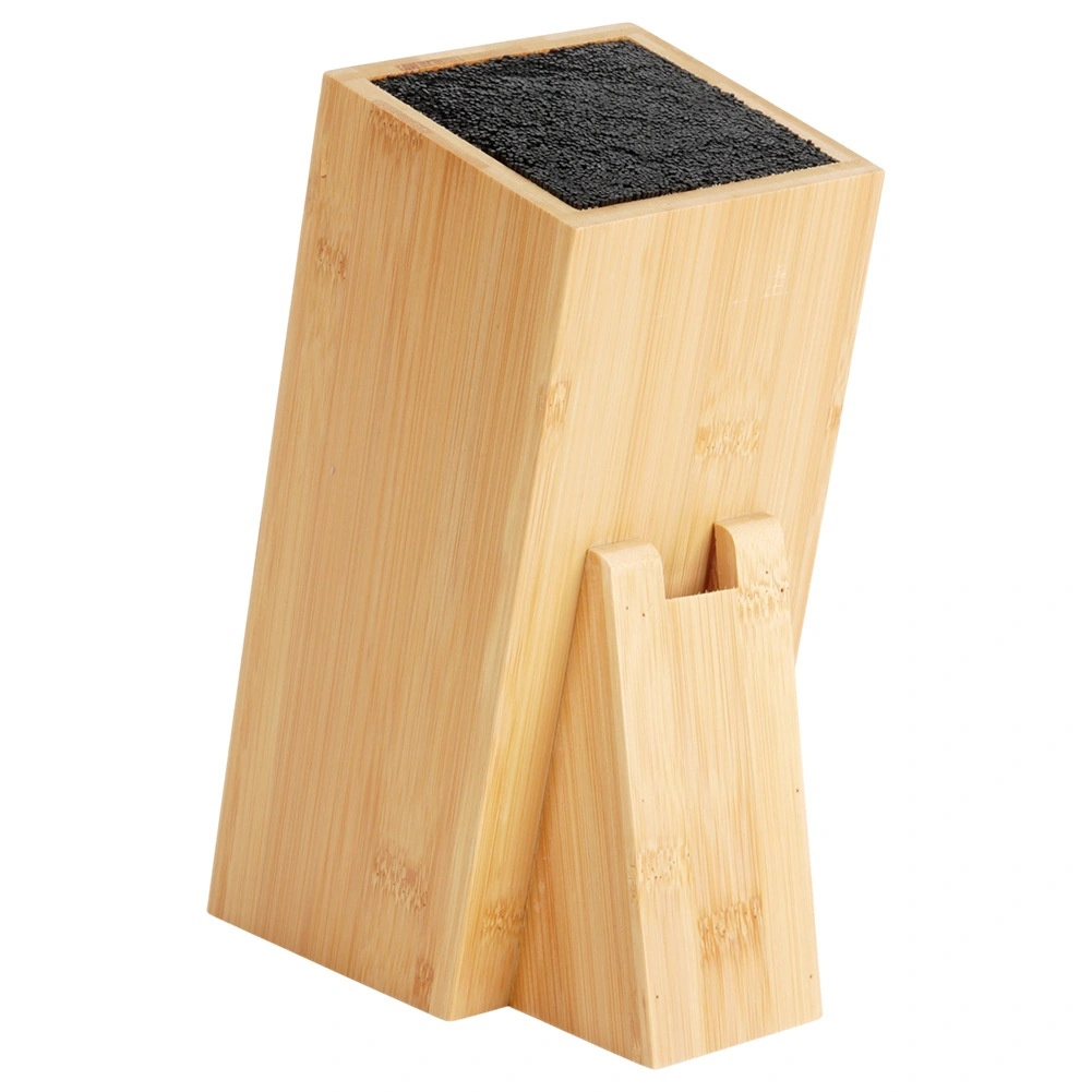Univerzální stojan na nože a kuchyňské náčiní z kvalitního bambusového dřeva kombinuje přírodní vzhled, stabilitu a praktické řešení úložného prostoru. Husté vyjímatelné vlákno uvnitř bloku se přizpůsobí každé čepeli, drží ji pevně na místě a současně chrání ostří před otupením. Šikmé provedení zajišťuje pohodlné vkládání a vytahování nožů.