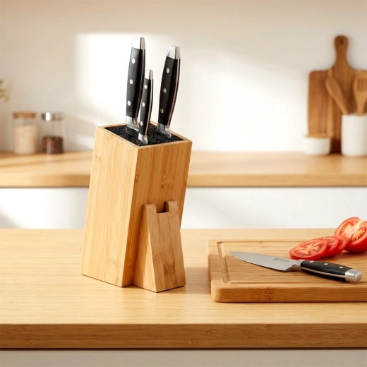 Tělo bloku je vyrobeno z kvalitního bambusového dřeva – odolného, hygienického a udržitelného materiálu s elegantním přírodním vzhledem.