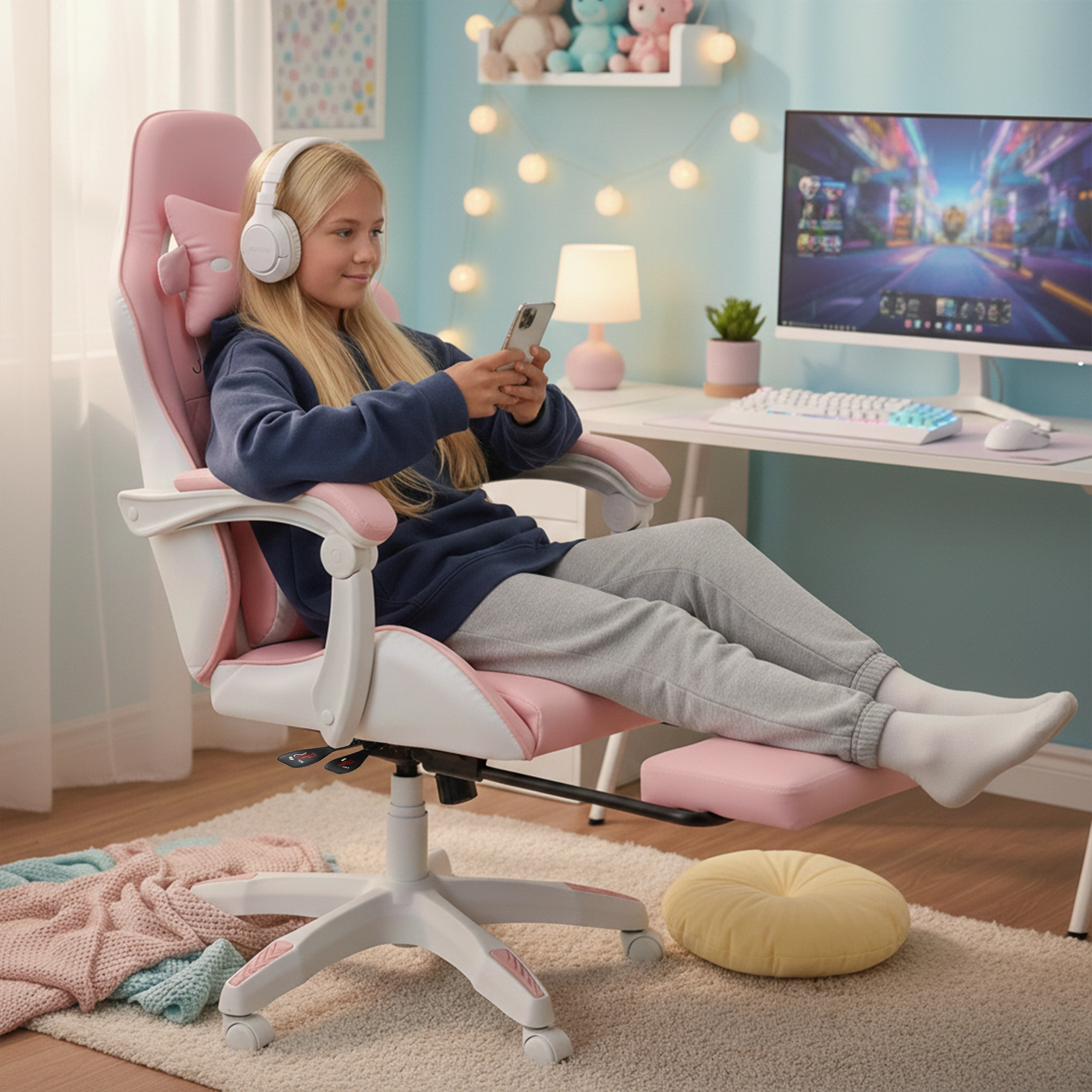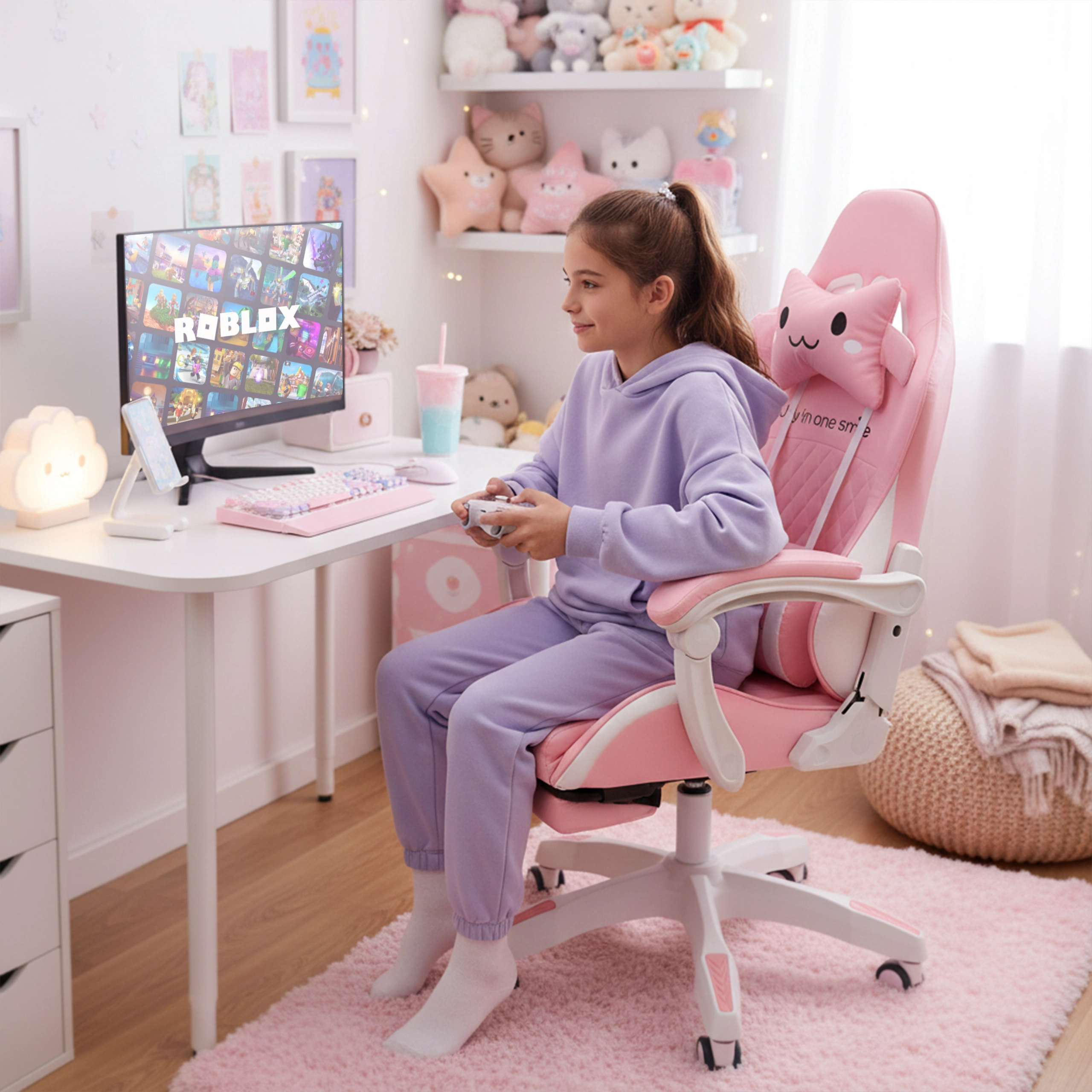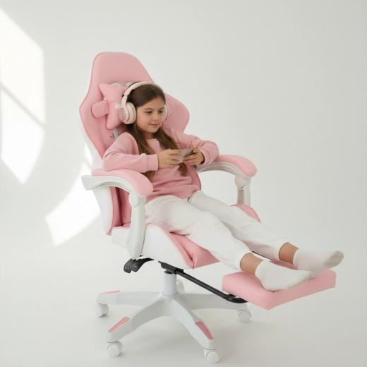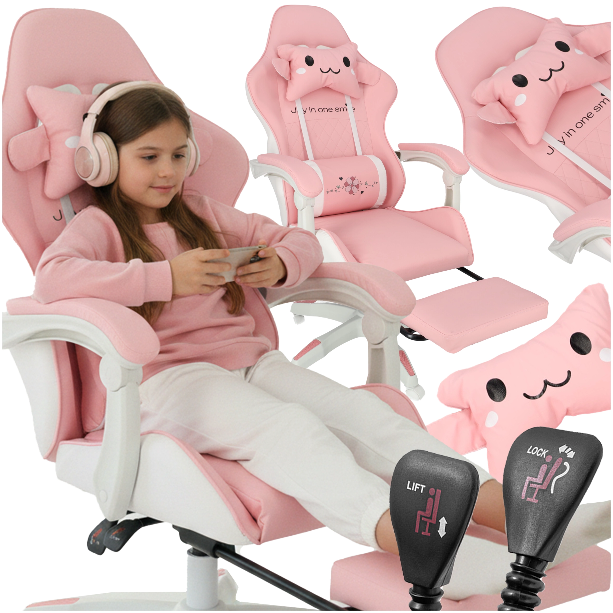 Růžová dětská herní a kancelářská židle kombinuje ergonomický komfort, nastavitelnou výšku a výsuvnou opěrku nohou pro rychlý odpočinek. Kbelíkové sedadlo se stabilní oporou zad, měkké područky s pěnou a plynulé otáčení o 360° s kolečky usnadní učení i hraní. Součástí jsou polštářky pro krk a bedra pro zdravější sezení v dětském pokoji.