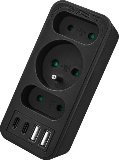 Ušetřete místo a kabeláž díky kompaktnímu rozbočovači, který kombinuje 3 síťové zásuvky s USB nabíjením. Dvě ploché zásuvky jsou ideální pro lampičky, nabíječky či kancelářské doplňky, zatímco uzemněná kulatá zásuvka spolehlivě obslouží zařízení s vyšší spotřebou, jako jsou počítače nebo kávovary.