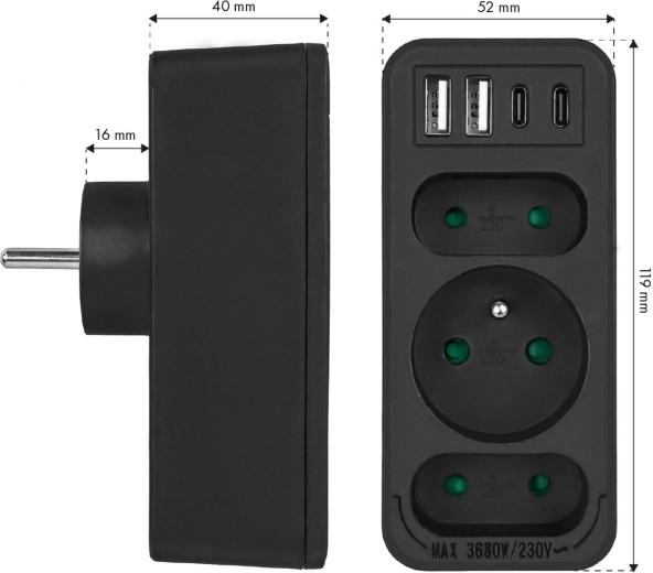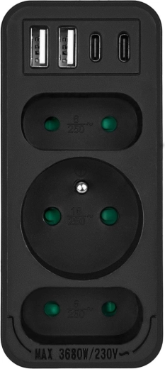Integrované porty 2× USB-A (max. 3 A / 18 W) a 2× USB-C s Power Delivery (max. 20 W) zajišťují rychlé a stabilní nabíjení moderních smartphonů, tabletů, powerbank i přenosných konzolí – bez nutnosti dalších nabíječek. Rozbočovač je tak ideální pro obývací pokoj, pracovnu i studentský pokoj.