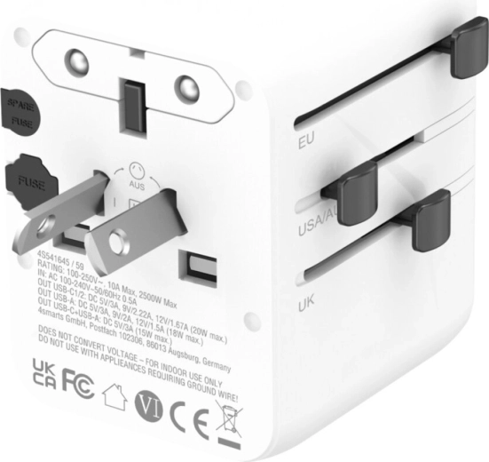 Praktické rozhraní zahrnuje 2x USB‑C a 1x USB‑A pro současné nabíjení telefonu, tabletu či powerbanky. Univerzální AC zásuvka s výkonem až 2500 W (10 A) umožní připojit i náročnější spotřebiče. Sady výsuvných vidlic pro EU, UK, USA/AUS a kompatibilita s více než 200 zeměmi vám zaručí bezproblémové použití po celém světě.