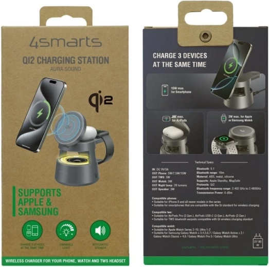 Multifunkční nabíjecí stanice 4smarts Aura Sound Qi2 v elegantní šedé barvě umožní současně dobíjet telefon, sluchátka i hodinky Apple nebo Samsung. Díky standardu Qi2 nabízí rychlé a stabilní bezdrátové nabíjení, magnetické uchycení pro jistotu a pohodlí a navíc integrované 3stupňové LED osvětlení a vestavěný reproduktor pro maximální komfort při práci i odpočinku.
