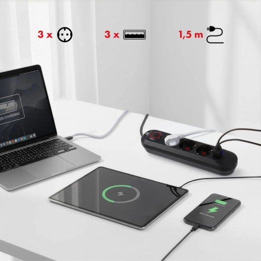 Tři zásuvky Schuko a tři USB porty umožní současně napájet spotřebiče a nabíjet telefon či tablet bez dalších adaptérů.