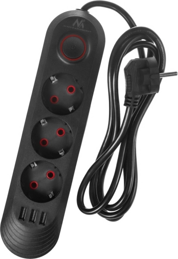 Prodlužovací přepěťová zásuvka s USB MCE394, 3 zásuvky Schuko + 3× USB, 1,5 m, černá