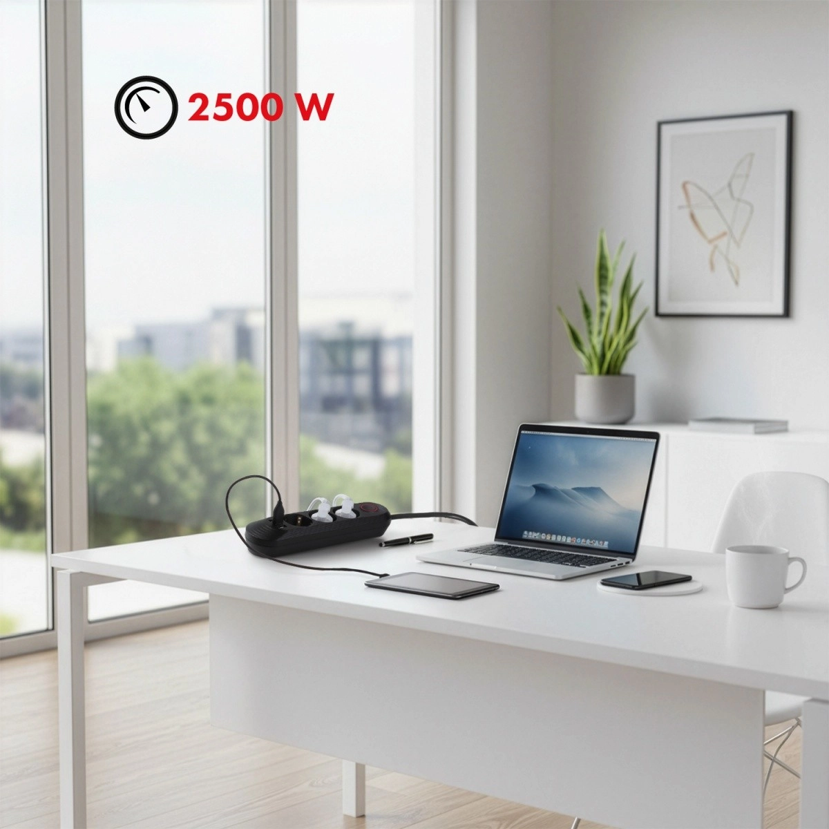 Udělejte si pořádek v kabelech a napájejte vše potřebné z jednoho místa. Tato prodlužovací lišta s 3 síťovými zásuvkami a 3 USB porty pohodlně obslouží notebook, lampu i nabíjení telefonu či tabletu. Díky univerzálnímu vstupu 110–240 V AC / 50–60 Hz a výkonu až 2500 W spolehlivě zvládne každodenní provoz.
