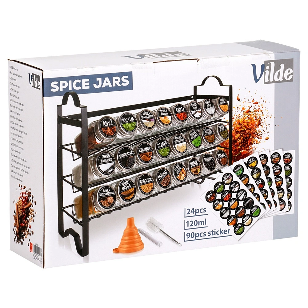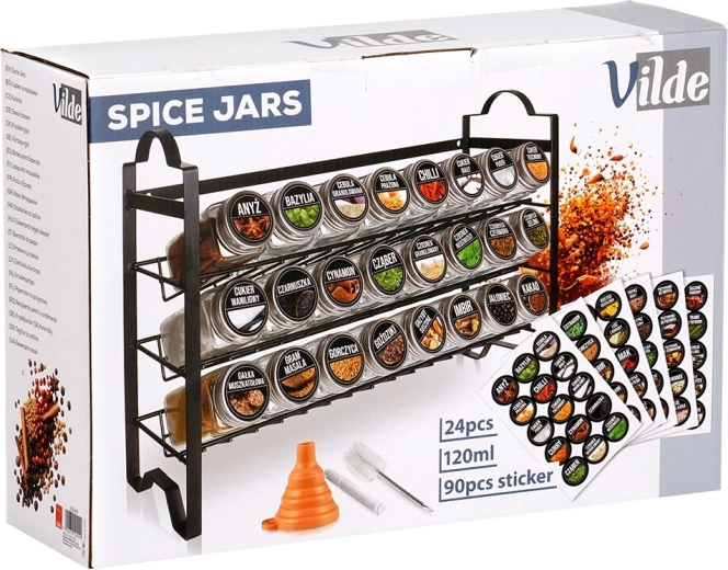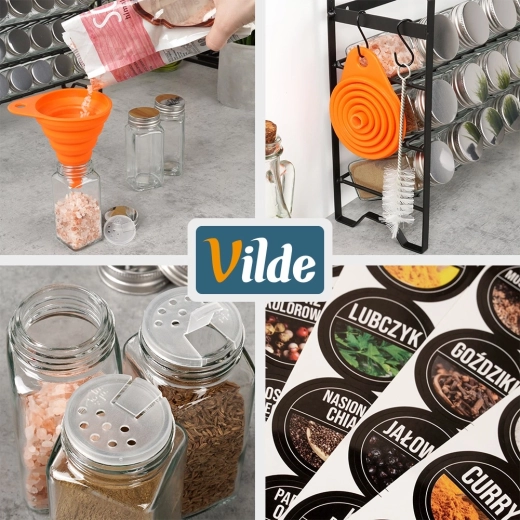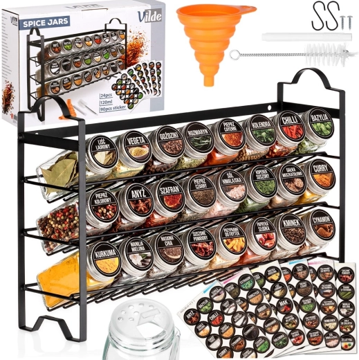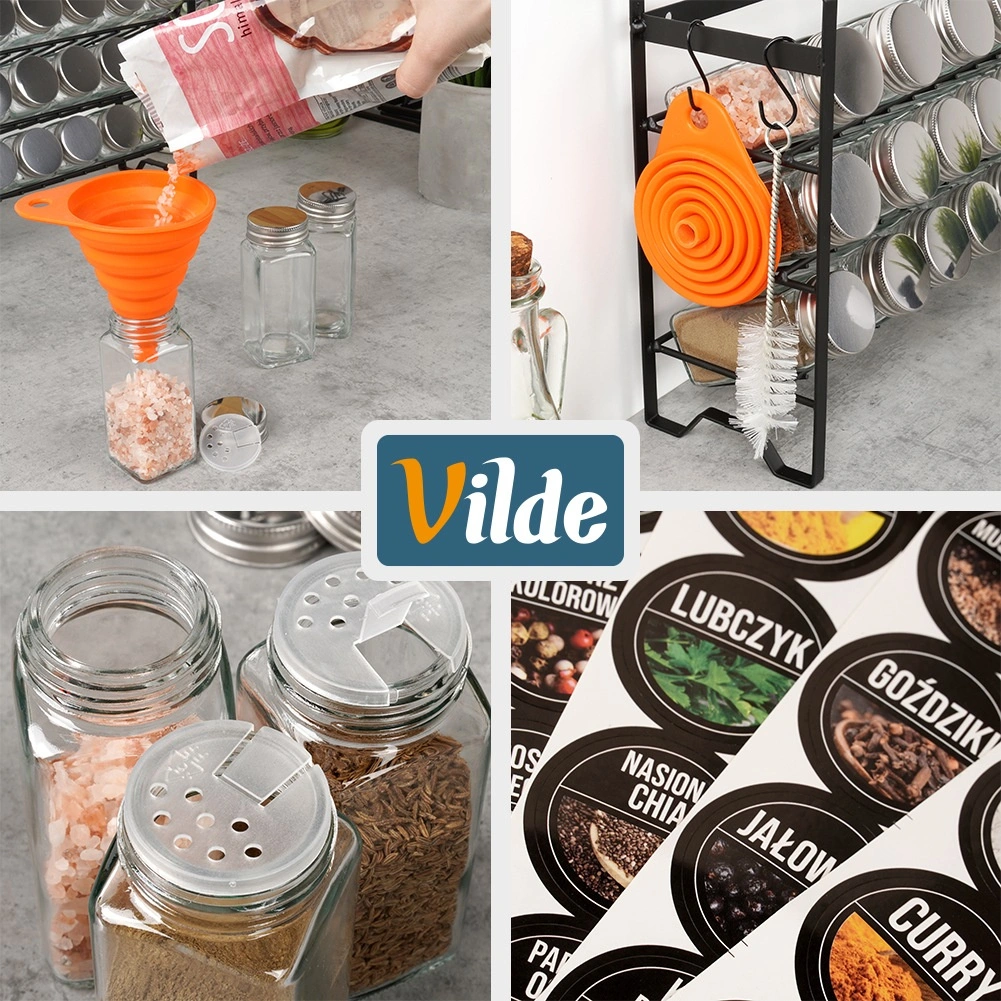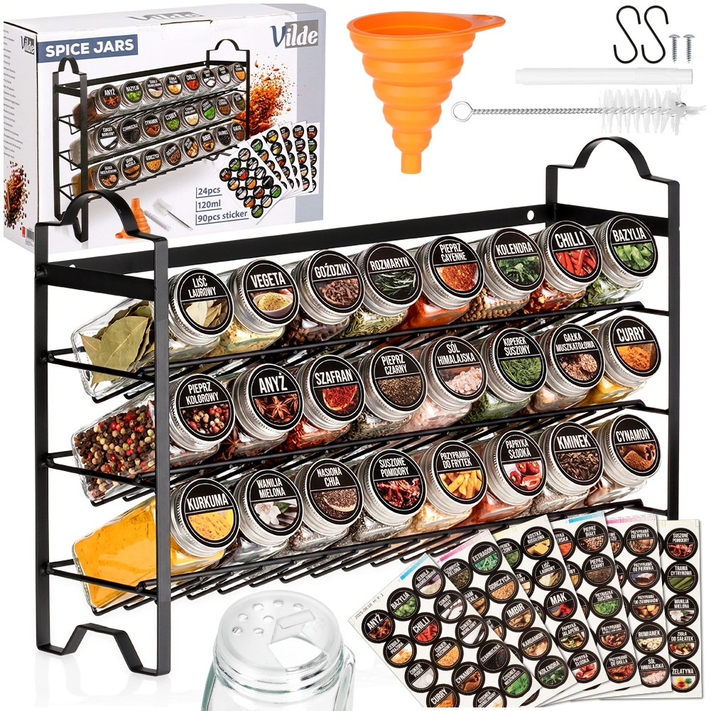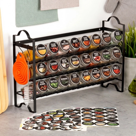 V balení najdete vše pro rychlou organizaci: 90 samolepicích štítků na označení druhů koření, skládací silikonový trychtýř pro snadné sypání, kartáček na čištění hrdla a 2 háčky na zavěšení drobných pomůcek. Polici lze postavit na kuchyňskou linku či stůl a díky industriálnímu vzhledu se hodí do moderních i klasických interiérů.