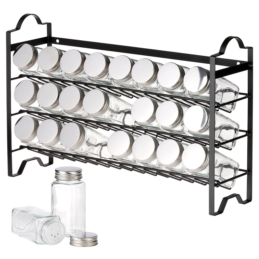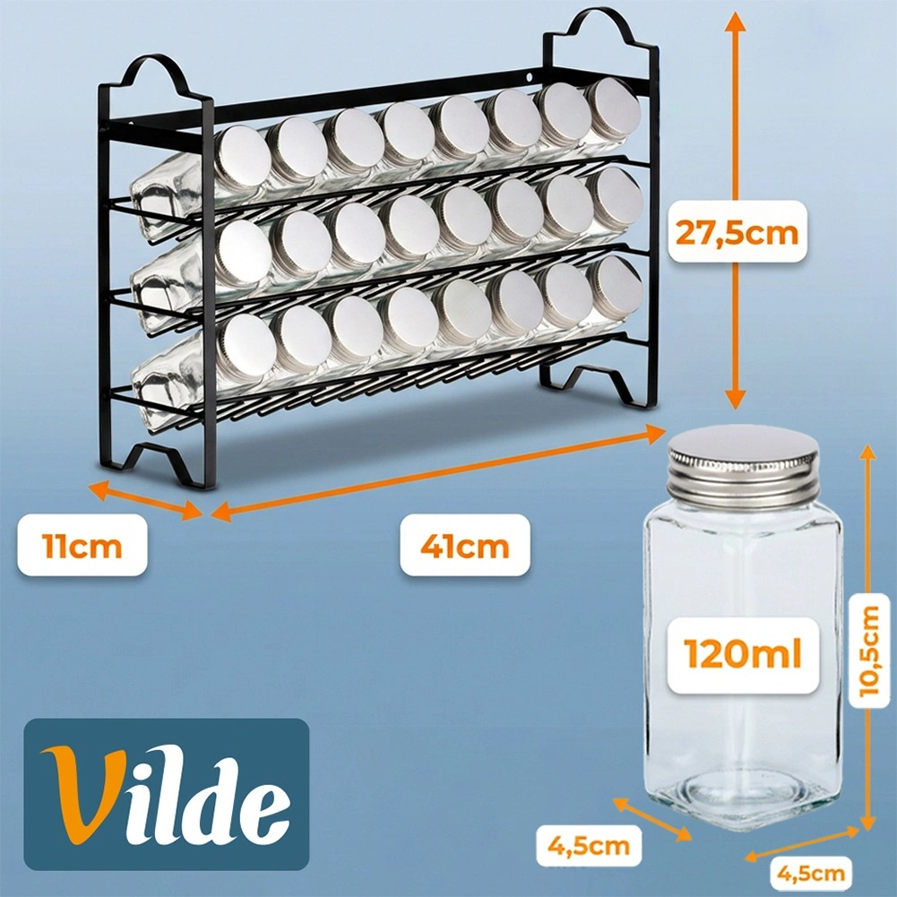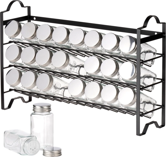 Stylová a funkční organizace koření pro každodenní vaření. Černá kovová police s třemi patry nabídne přehledné uložení koření, bylinek i drobných kuchyňských doplňků. Skleněné dózy s průhlednými sítky usnadňují dávkování a těsnící víčka chrání před vlhkostí, aby si koření déle uchovalo aroma.