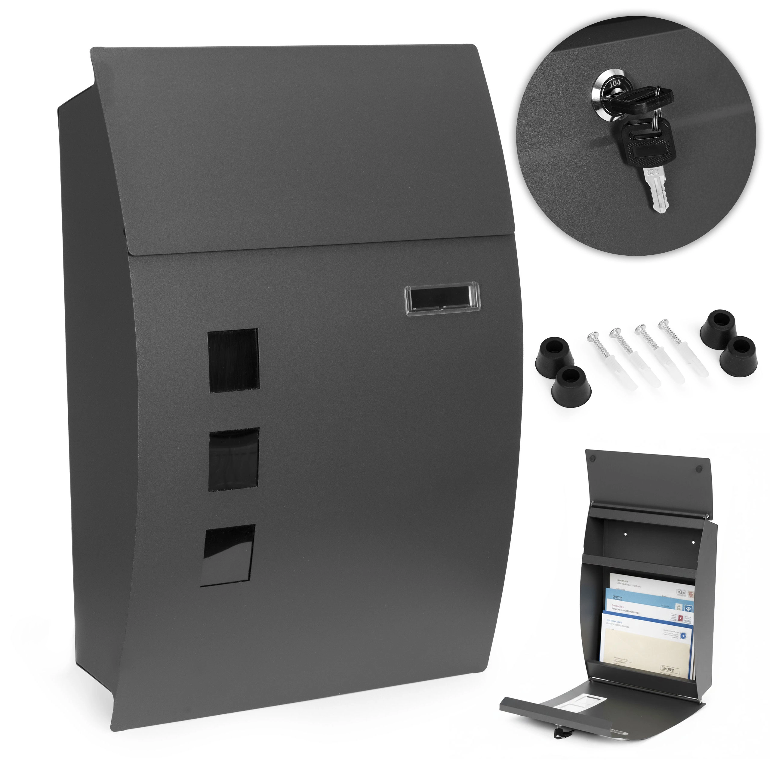 Pro pohodlné každodenní používání je vybavena širokými dvířky pro snadný přístup, průhledovými okénky pro rychlou kontrolu doručené pošty a zámkem se dvěma klíči pro jistotu a soukromí. Montáž je jednoduchá díky přiloženým hmoždinkám, šroubům a gumovým distančním podložkám, které zlepšují odvětrání a snižují riziko kondenzace.