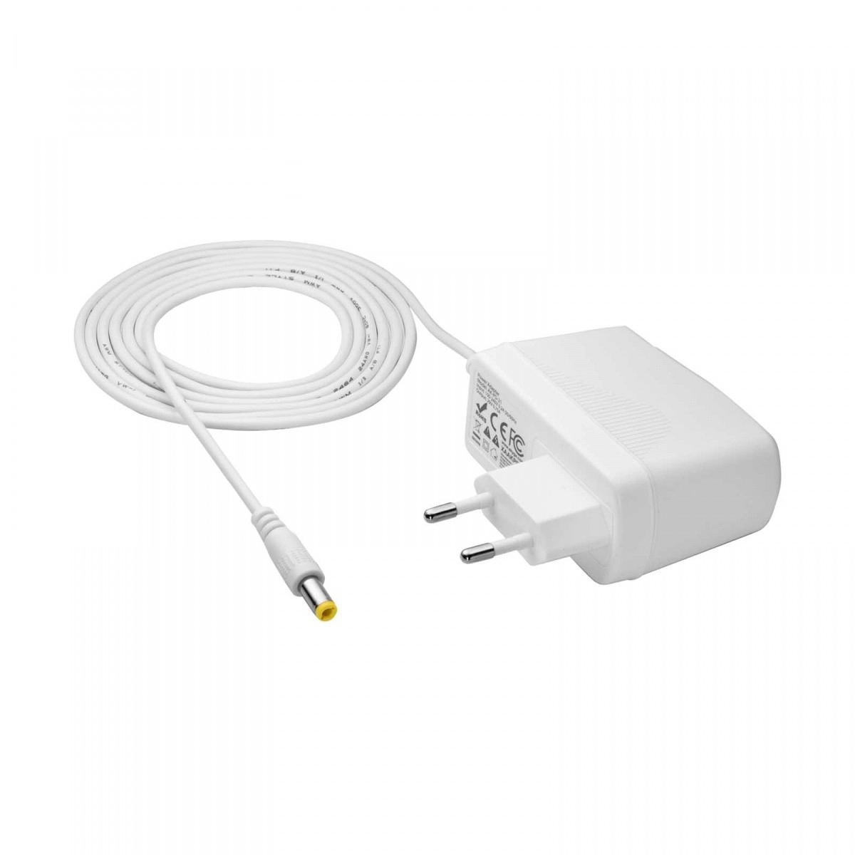 Adaptér je vybaven koaxiálním DC konektorem 5,5 × 2,5 mm s odolným odlehčením tahu pro dlouhou životnost. Kompaktní zpracování s přímým zapojením do zásuvky šetří místo a usnadňuje každodenní používání.