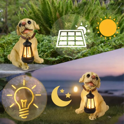 Tato solární dekorativní lampa spojuje kouzlo realistické psí sošky s praktickým osvětlením. Zavěšená lucerna poskytuje jemné, teplé světlo pro večerní atmosféru a orientační nasvícení chodníčků, vstupu či záhonů. Odolné provedení z pryskyřice/plastu zvládne déšť i slunce a snadno se udržuje.