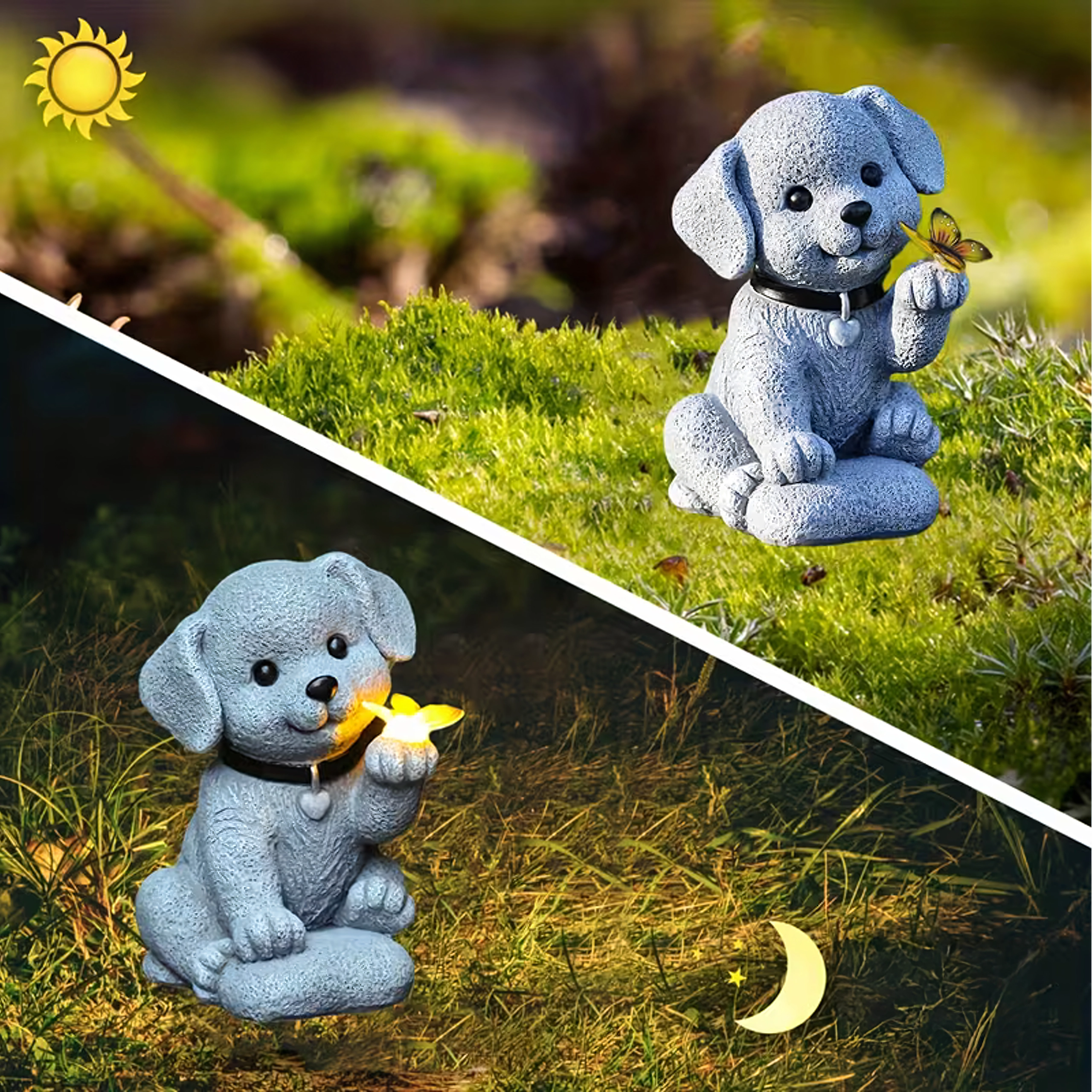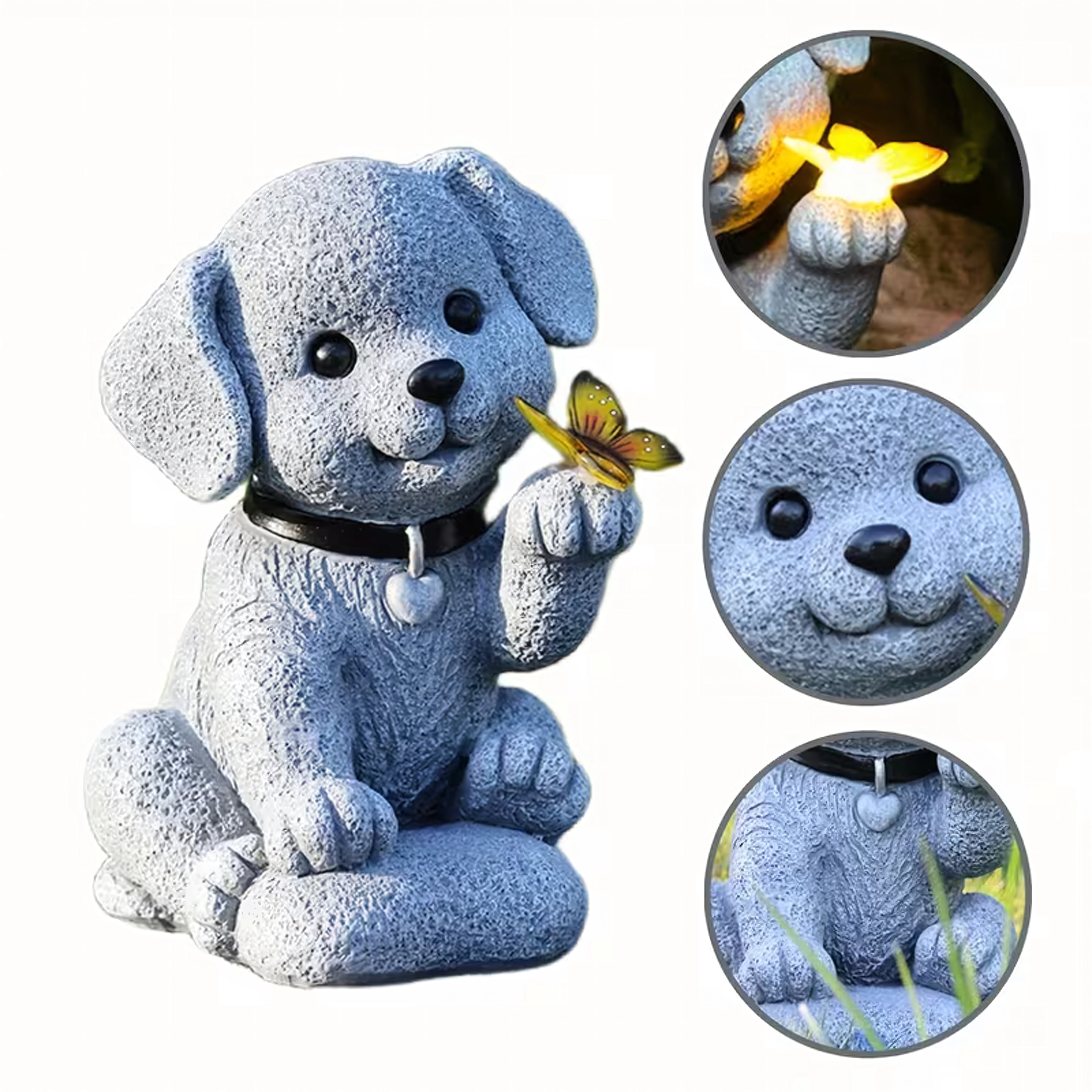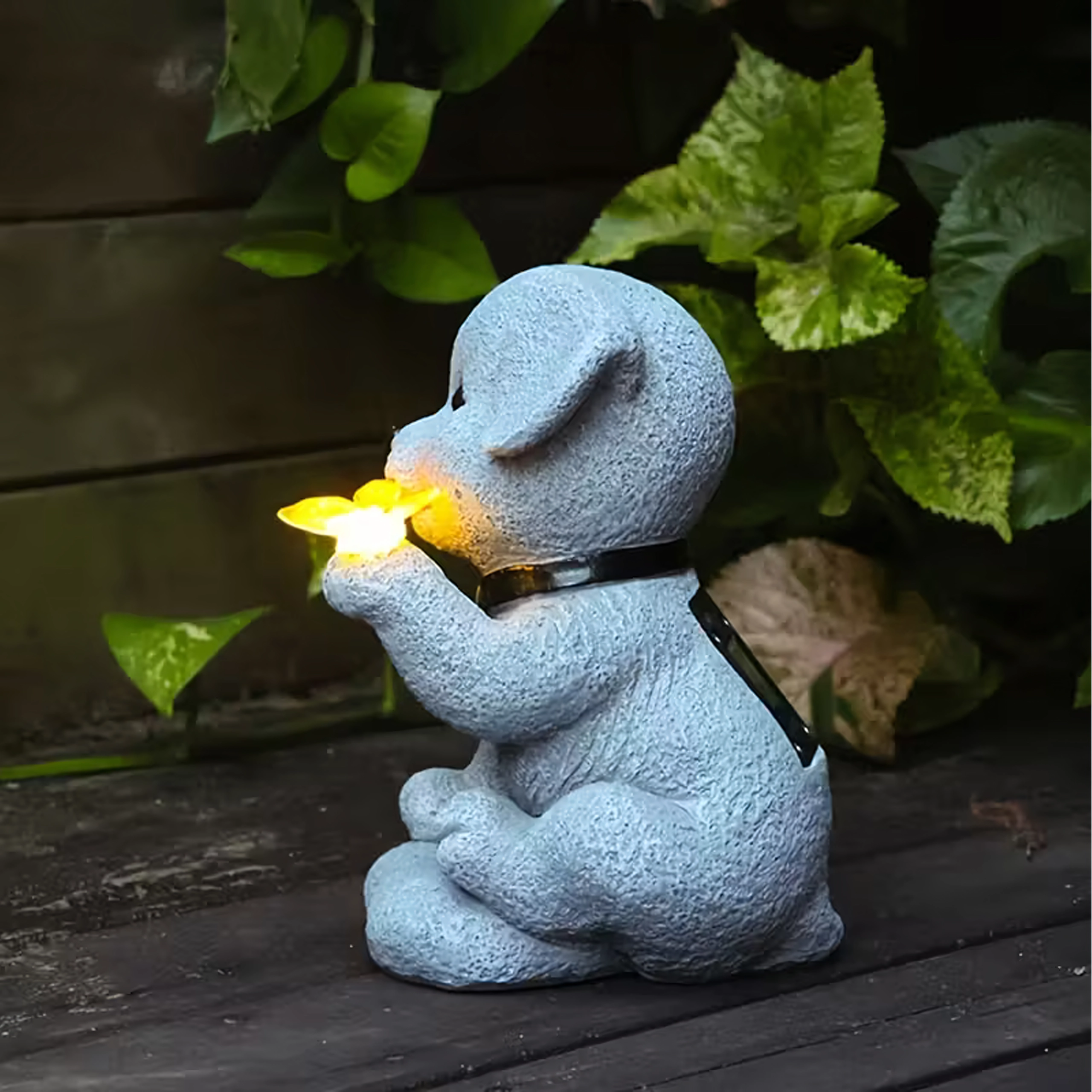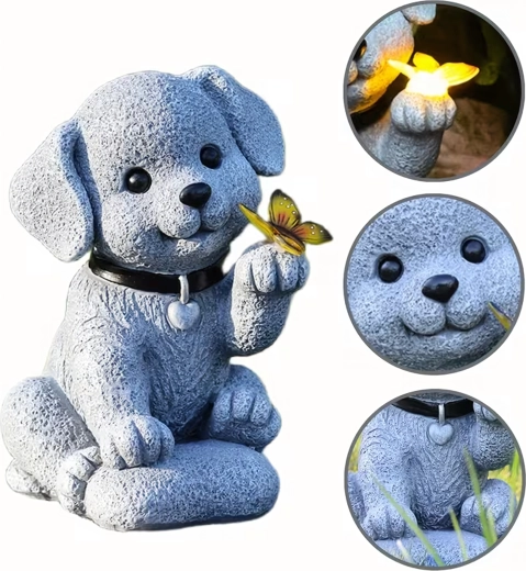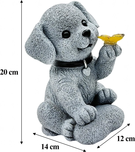 Tato stylová solární zahradní lampa pes s motýlem spojuje půvab dekorace s praktickým osvětlením. Motýl v tlapce se po soumraku rozsvítí příjemným teplým světlem a vytvoří útulnou atmosféru na zahradě, u vstupu, na terase i na okenním parapetu.