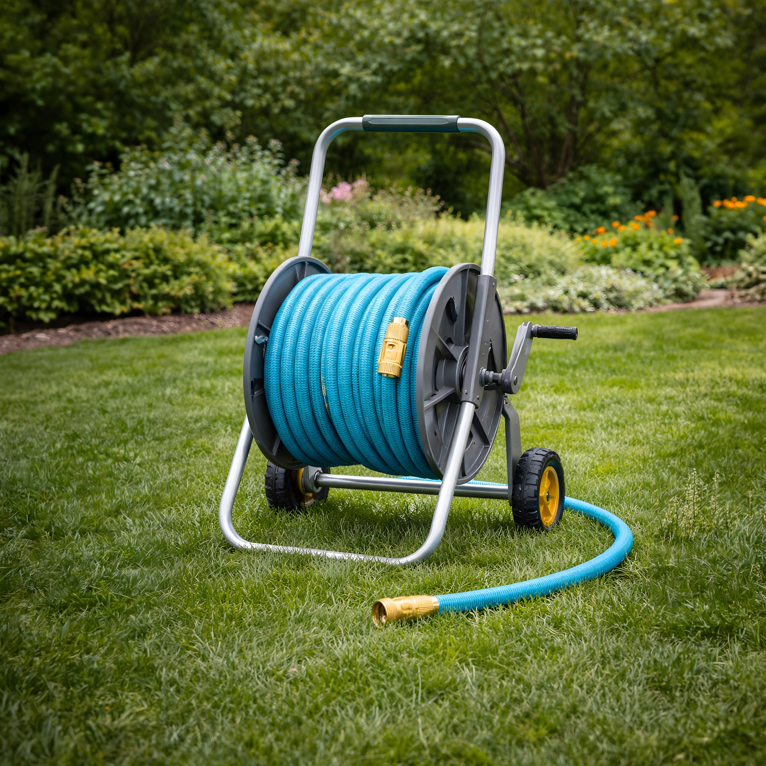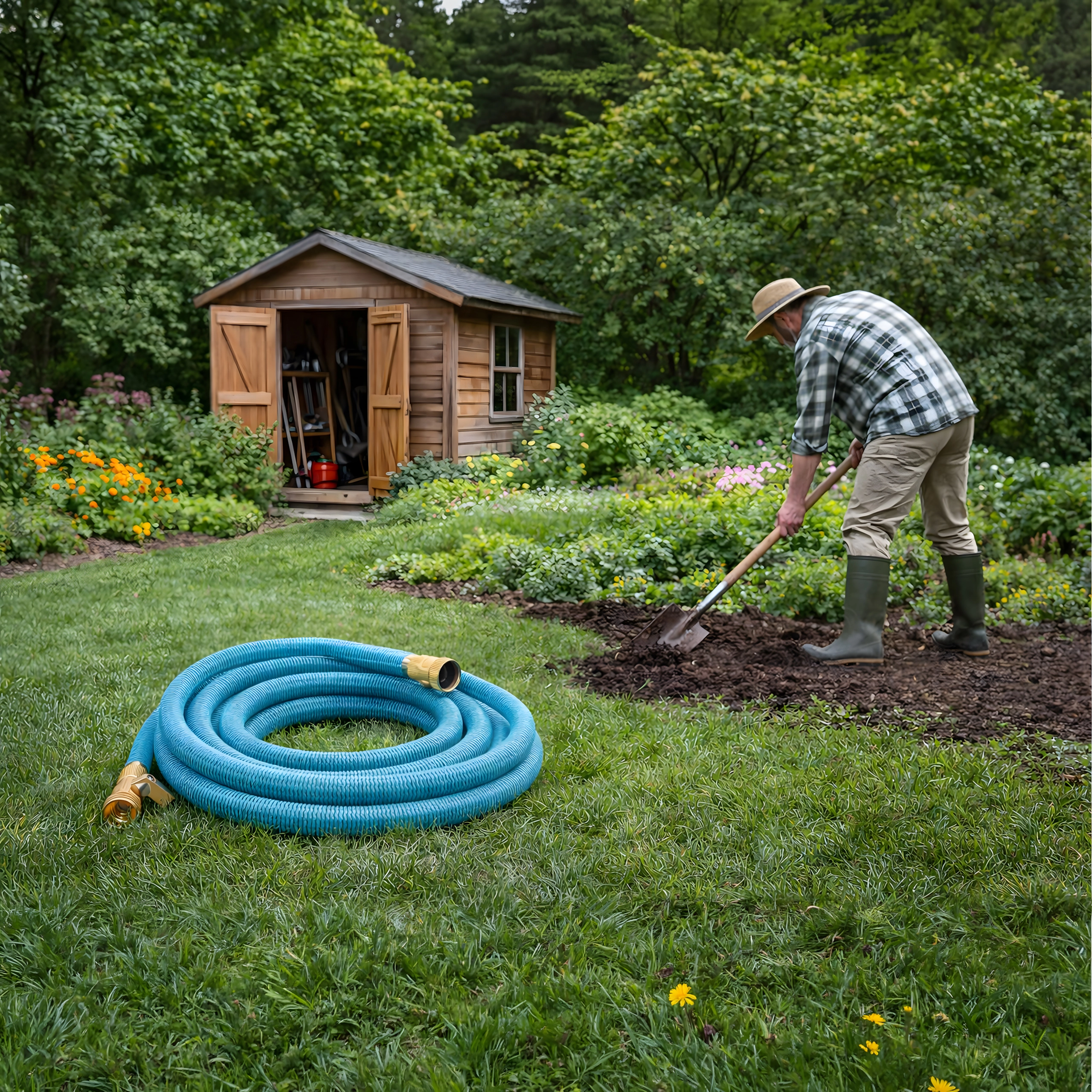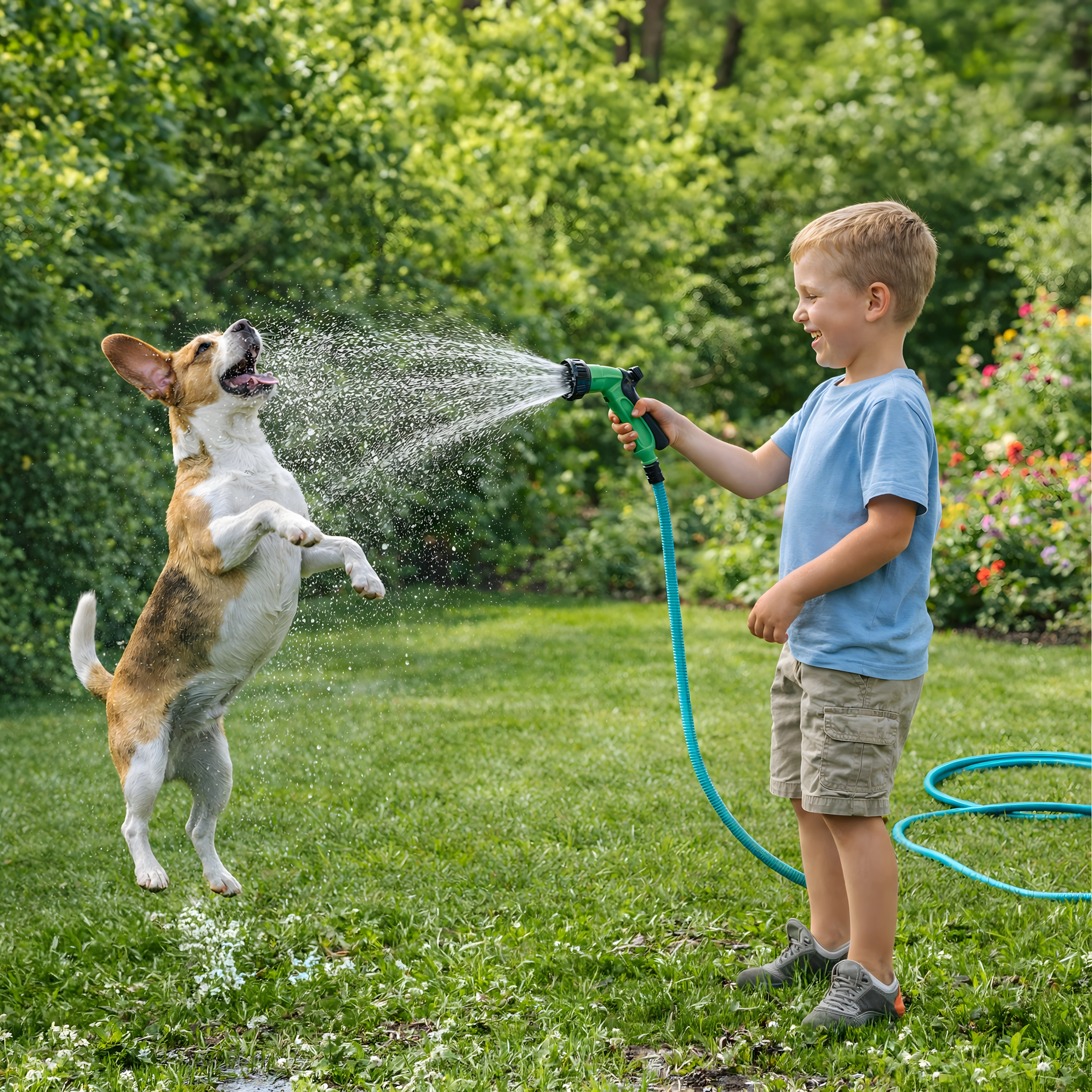 Součástí je vícerežimová stříkací pistole pro jemnou mlhu, sprchu i silný proud – ideální na zalévání záhonů, mytí auta nebo oplach teras. Hadice je lehká, snadno se přenáší a uloží na držák či do boxu.