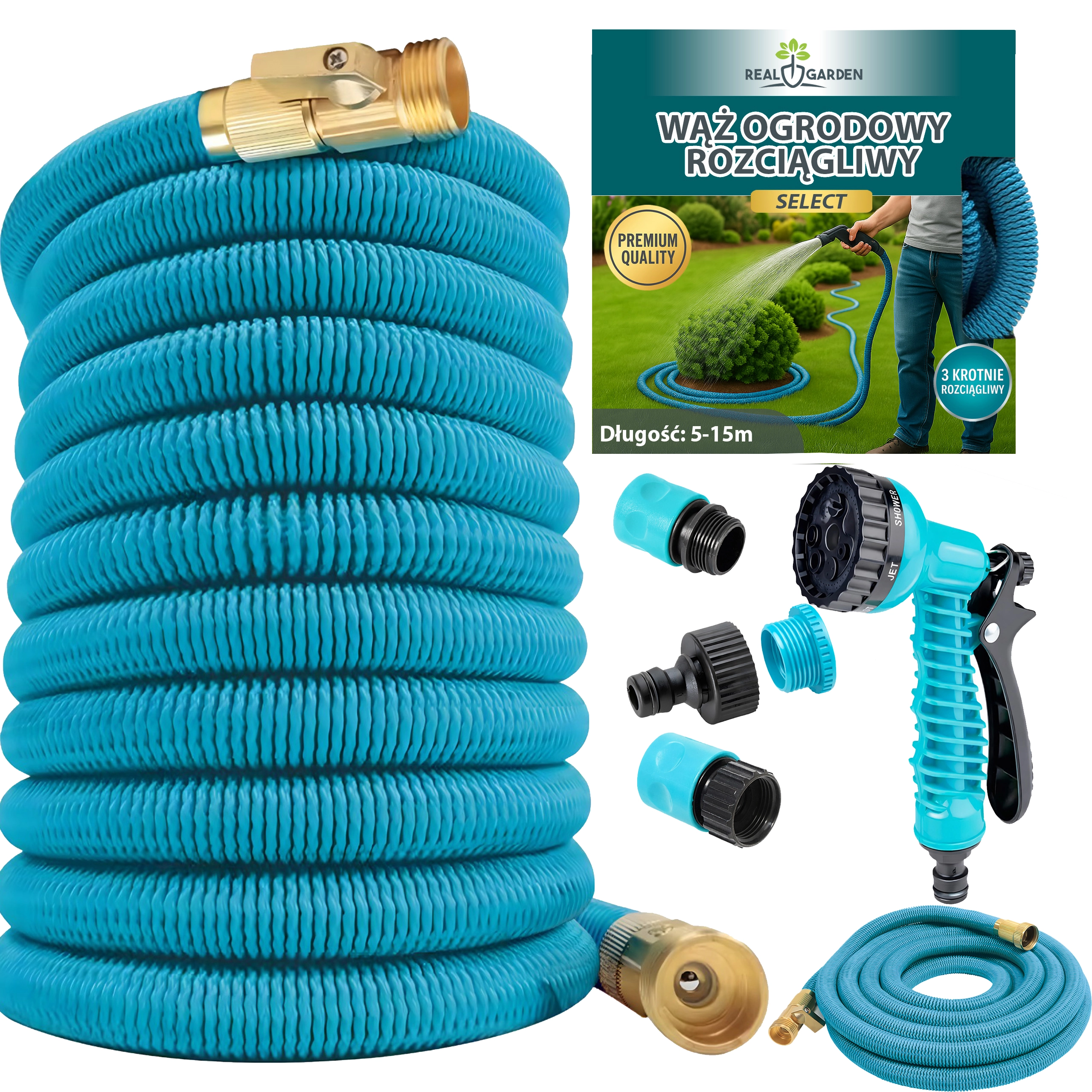 Lehká a roztažitelná zahradní hadice 5–15 m s kovovými konektory 1/2" a 3/4" a víceúčelovou stříkací pistolí pro zalévání i čištění. Nabízí odolnou tkanou strukturu, je neuzlovatelná, snadno se skladuje a díky ventilu umožňuje rychlé ovládání průtoku.