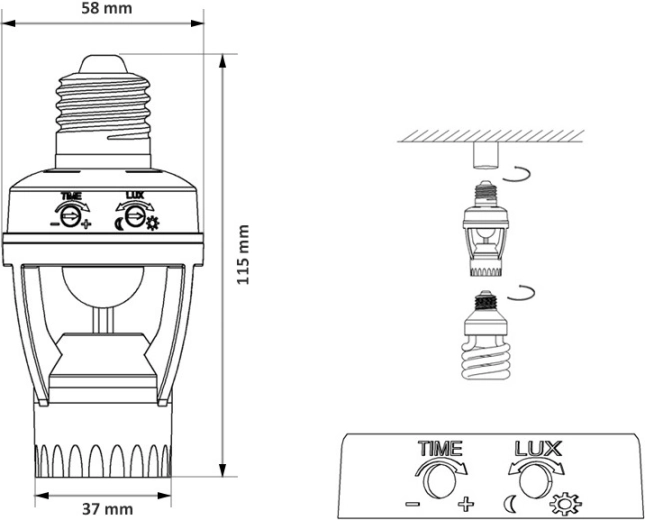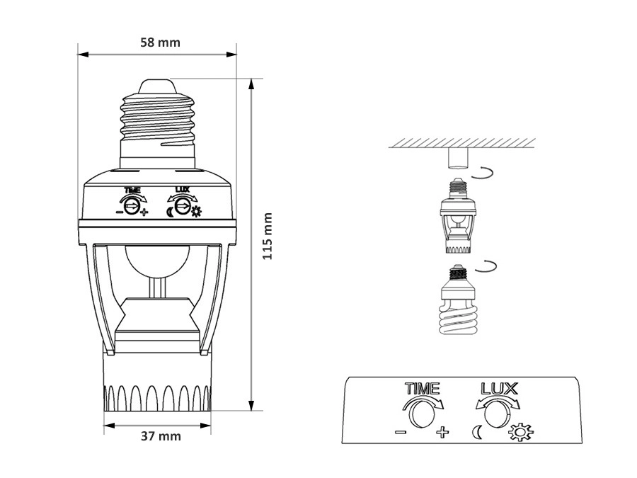 Instalace je otázkou minut: jednoduše našroubujte do stávající patice E27 a vložte žárovku. Pomocí otočných regulátorů snadno nastavíte čas dosvitu (TIME) a prahovou úroveň osvětlení (LUX). Snímač využívá infračervenou detekci (PIR) a spolehlivě rozpozná den/noc, čímž šetří energii i vaše náklady.