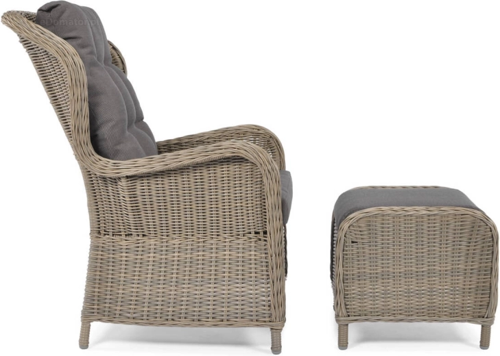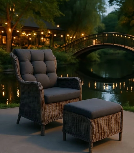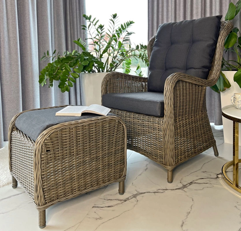 Designové křeslo SONATA s podnožkou přináší komfort, styl a praktičnost do každého venkovního prostoru. Kombinace polyratanu a hliníkového rámu zajišťuje nízkou hmotnost, pevnost a dlouhou životnost bez koroze. Silné, prošívané grafitové polštáře se postarají o pohodlné sezení i při delším relaxu.