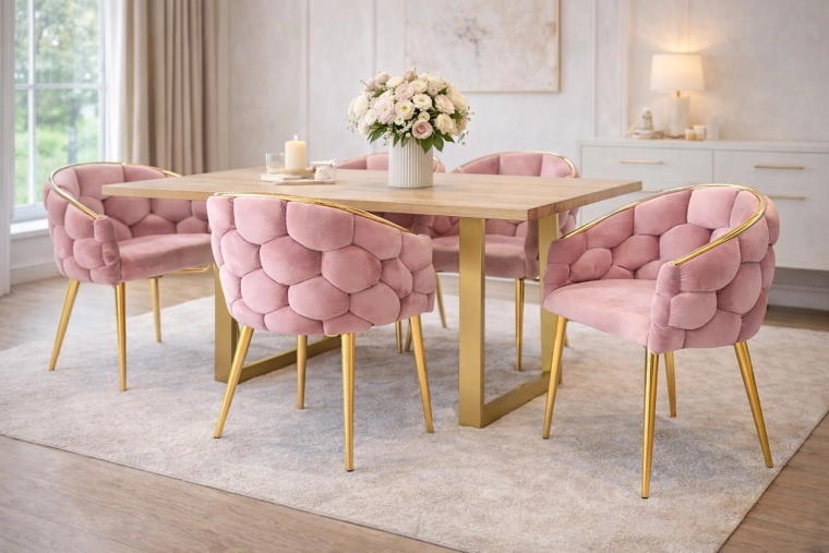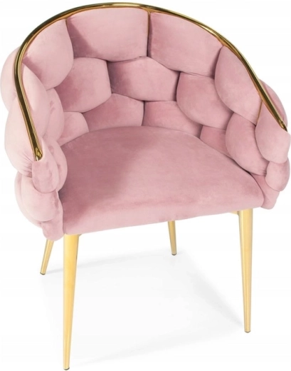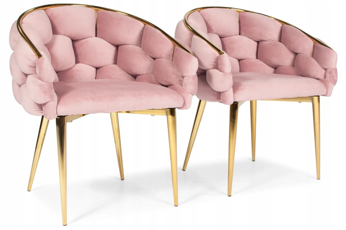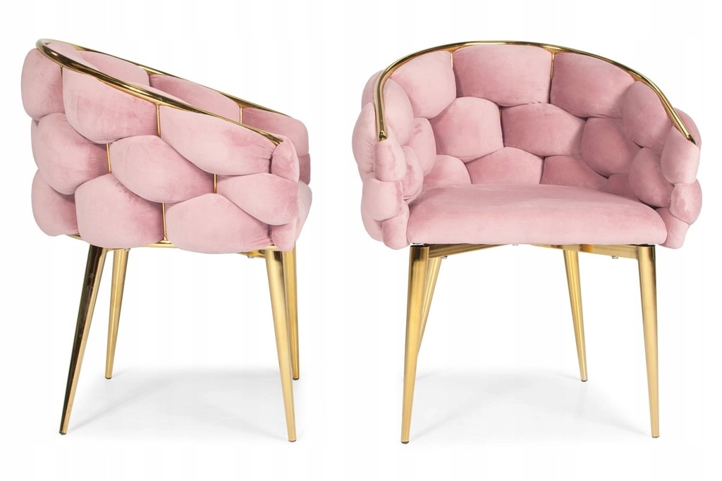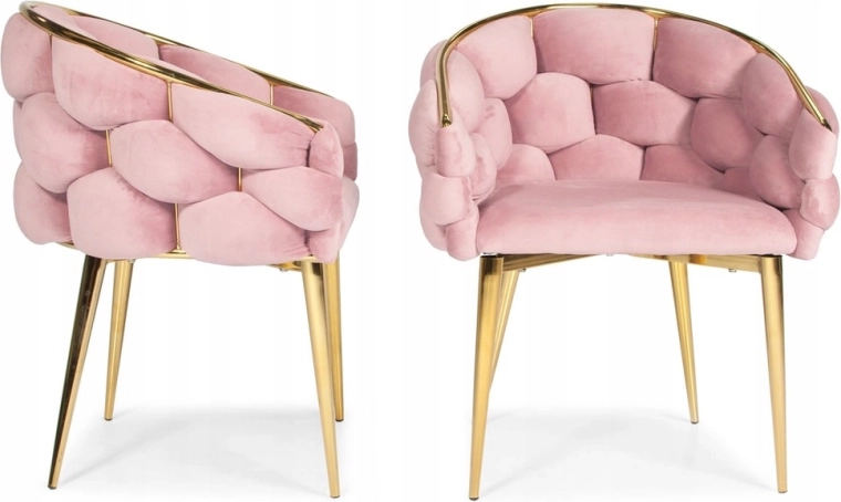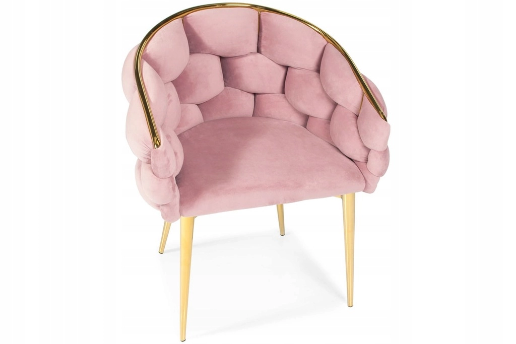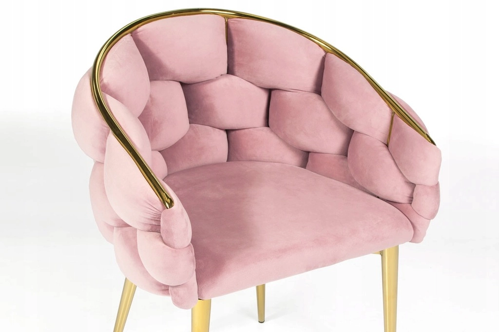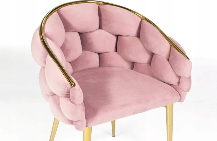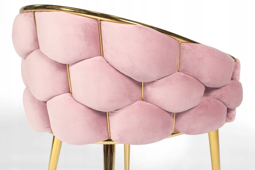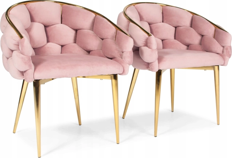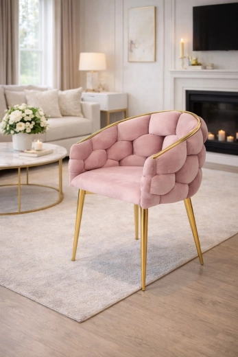 Elegantní židle v glamour stylu s růžovým sametem a zlatými kovovými nohami nabízí komfortní korpusové (bucket) sezení s oporou zad. Měkké sametové čalounění s jemným leskem dodá interiéru šmrnc, zatímco pevná ocelová konstrukce zajistí stabilitu pro každodenní používání – ideální do jídelny, obýváku i ke kosmetickému stolku.