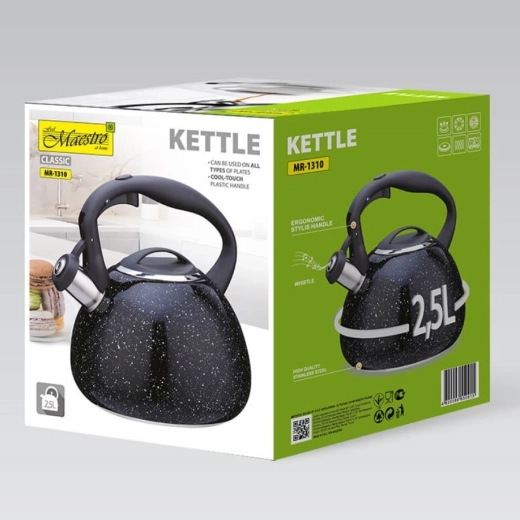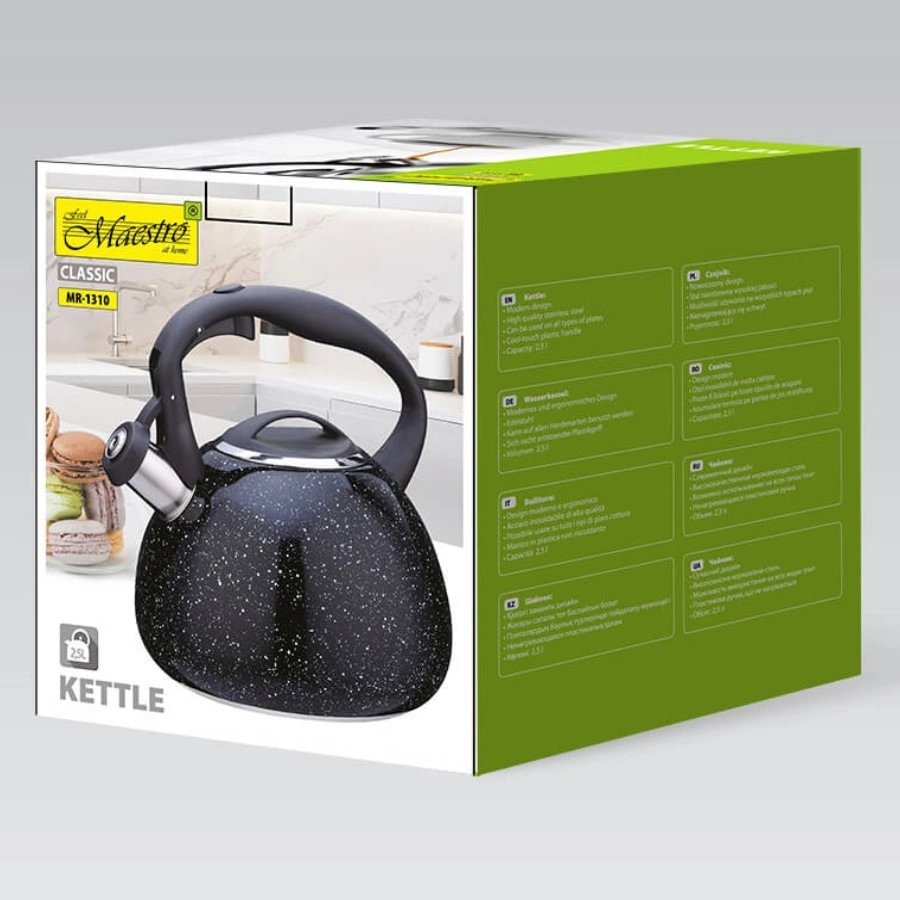 Stylová a odolná konvice MAESTRO s objemem 2,5 l je ideální pro každodenní vaření vody. Má pískající náustek pro bezpečné použití, vysoce kvalitní nerezovou ocel pro dlouhou životnost a vícevrstvé kapslové dno pro rychlé a rovnoměrné ohřívání. Díky odnímatelnému víku se snadno plní i čistí a je vhodná pro všechny typy sporáků včetně indukce.
