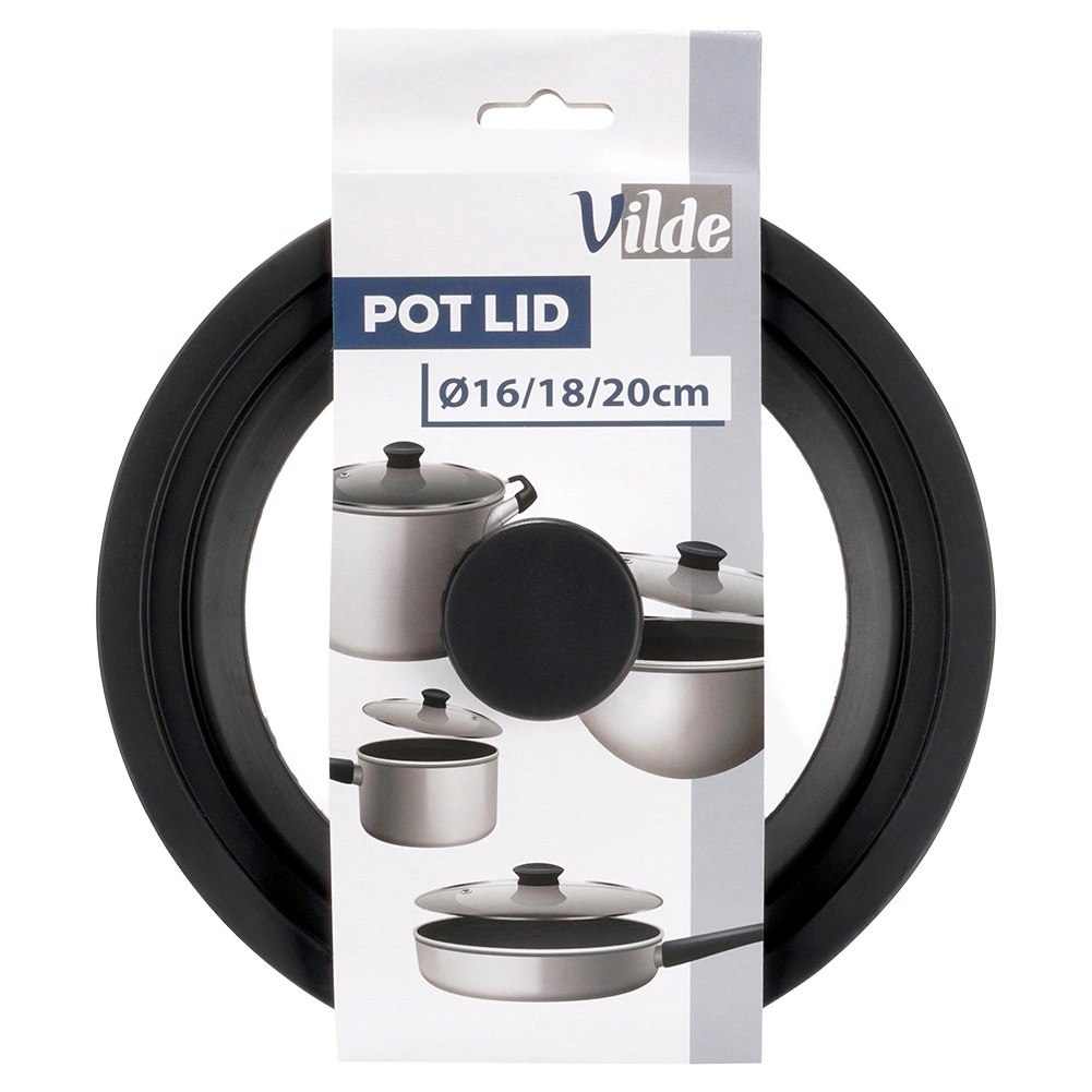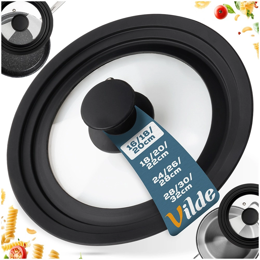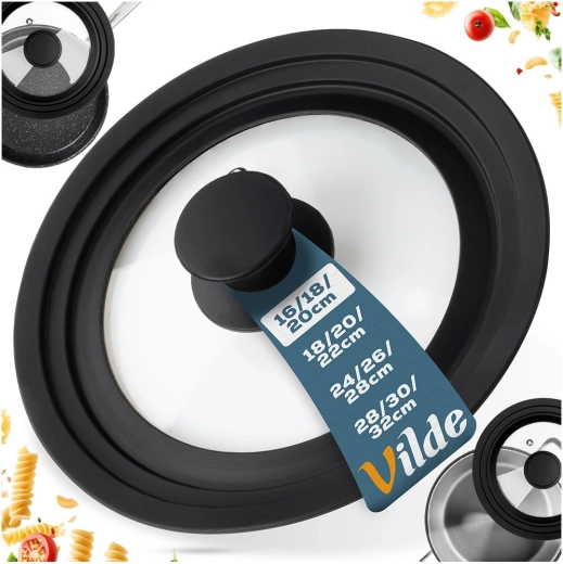 Univerzální poklice Vilde kombinuje odolné tvrzené sklo a pružný silikon v elegantní černé barvě. Díky stupňovanému silikonovému lemu bezpečně pasuje na více průměrů (16/18/20 cm), těsní, chrání hrany nádobí a pomáhá udržet pořádek na varné desce. Průhledné sklo umožňuje sledovat vaření bez zvedání poklice, zatímco odvětrávací otvor řídí únik páry a snižuje riziko překypění.