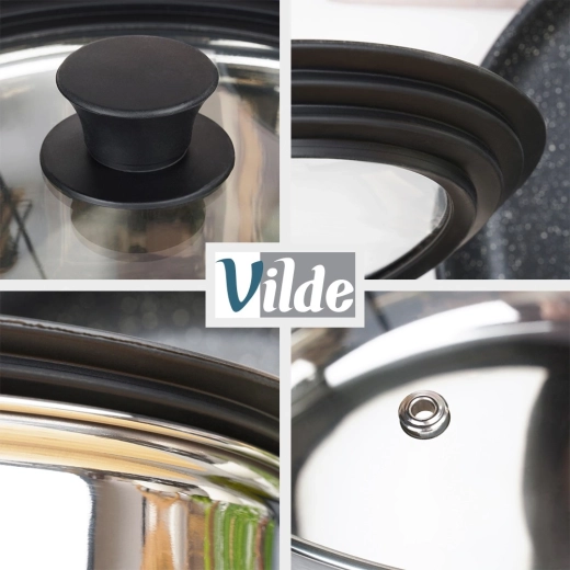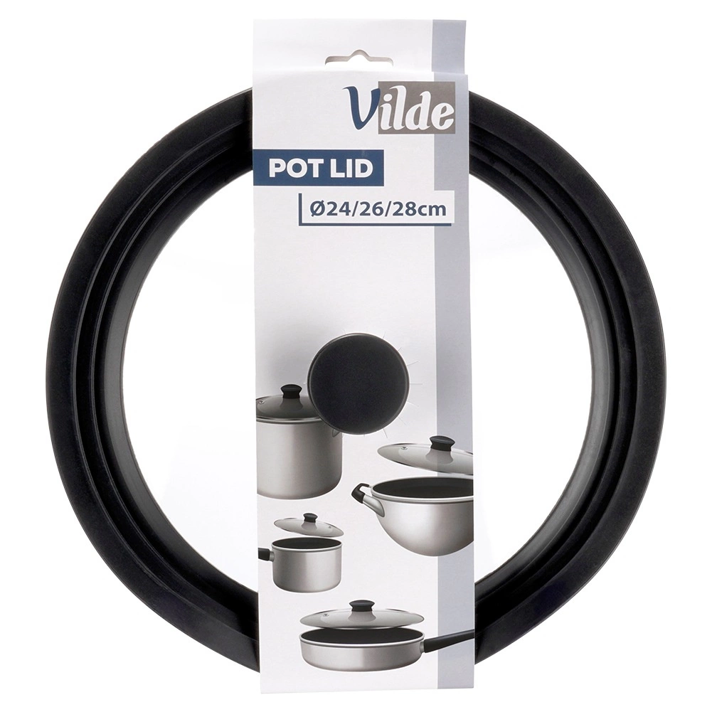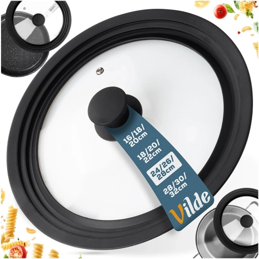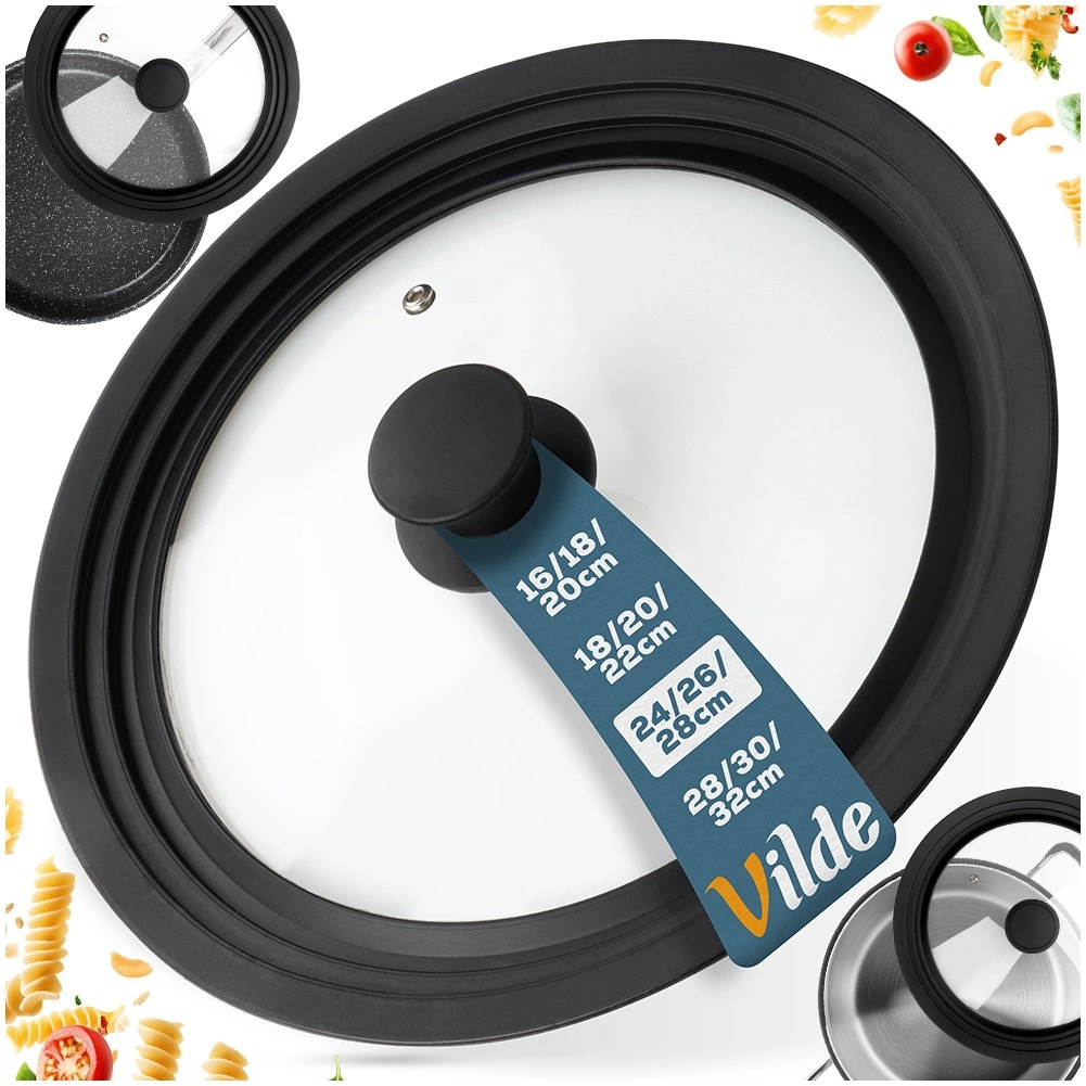 Praktická univerzální poklice 3v1 pro hrnce a pánve o průměru 24, 26 a 28 cm šetří místo v kuchyni a zajišťuje perfektní těsnění. Díky širokému silikonovému okraji chrání hrany nádobí, průhledné tvrzené sklo umožňuje kontrolu vaření a integrovaný ventil pro páru brání překypění. Vhodná do myčky, odolná vůči vysokým teplotám a vybavená ergonomickým úchytem. Originální produkt značky VILDE.