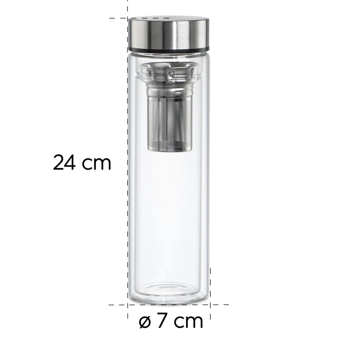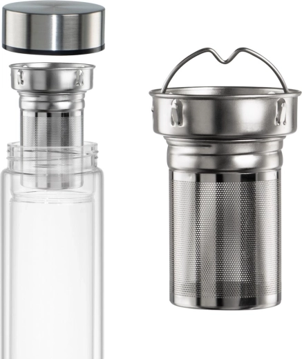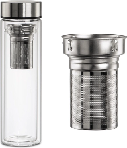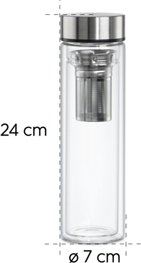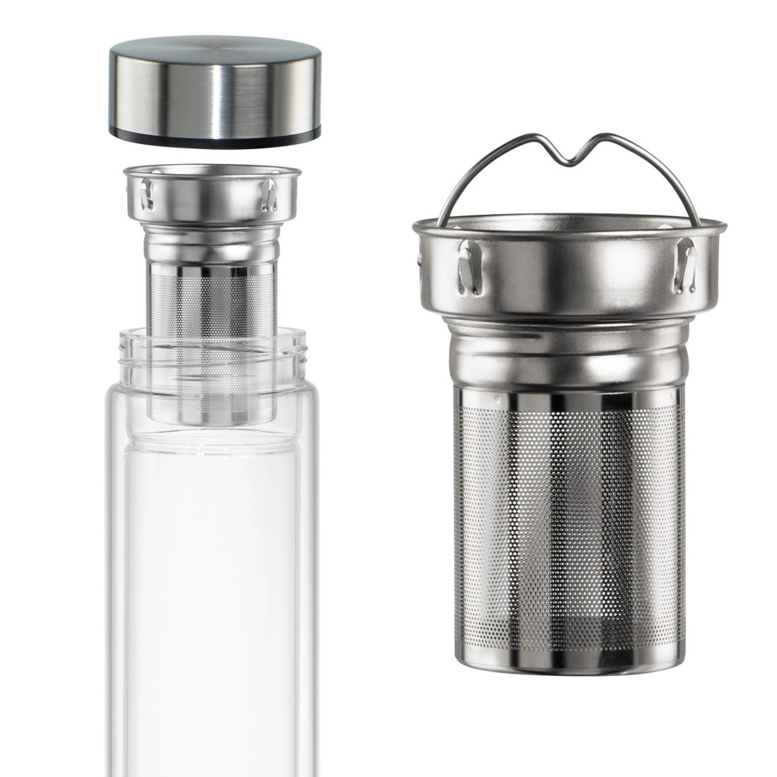 Díky kvalitnímu borosilikátovému sklu je lahev lehká, odolná a chuťově neutrální. Nerezové víčko se silikonovým těsněním zabraňuje protékání v tašce či batohu. Vyjímatelné jemné sítko s praktickým úchytem usnadňuje manipulaci i čištění.